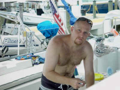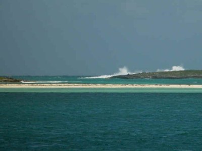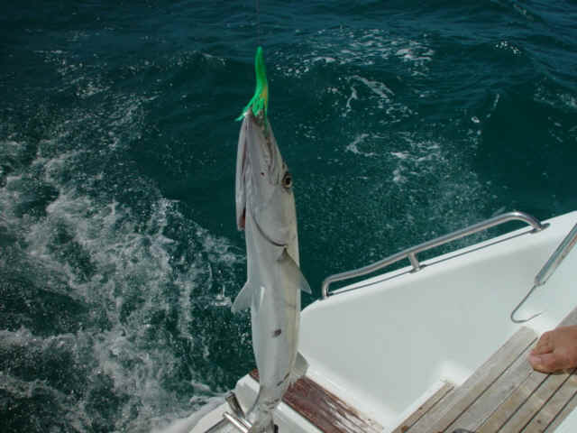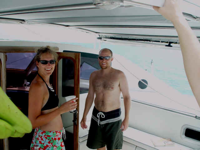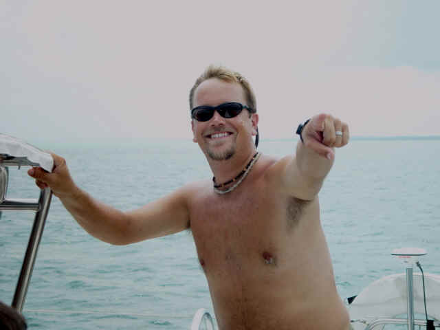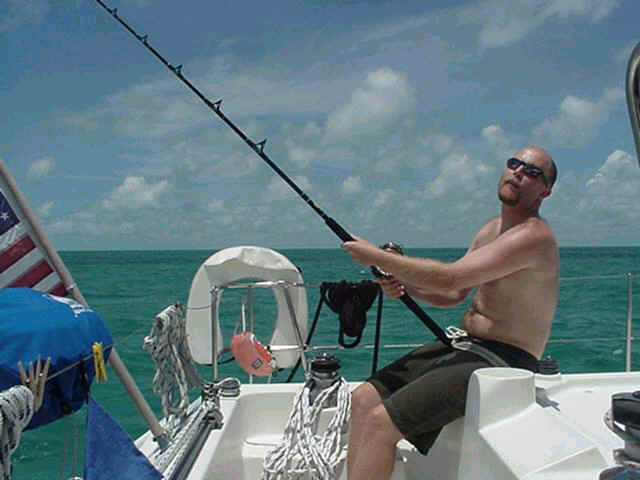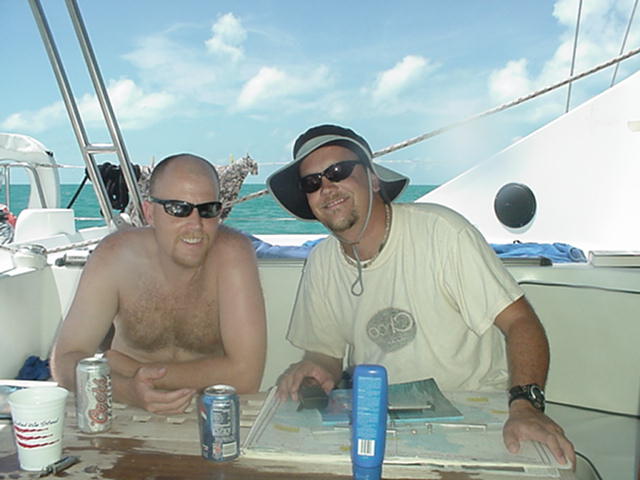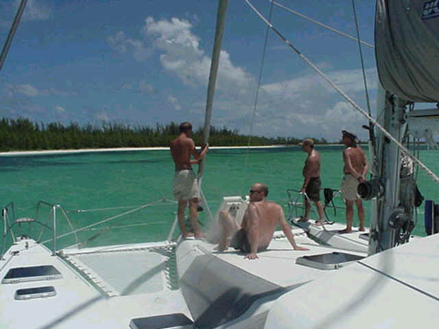 You can't keep us out !!!! This was written on the wall of the bar at Green Turtle Cay. Go Pack !! Ship's Log - August 14, 2002 It's midday and Dewayne still doesn't have a beer in his hand. We are getting worried about him. Bow riding has been like bronco riding today! The seas are at least 5 feet and we are beating directly into them, but the Stray Cat is handling them like a dream. We caught a Barracuda in mid afternoon. He was almost 2 feet long w/ plenty of teeth. 7:45pm - Anchored @ Green Turtle Cay, we headed ashore, freshly showered to find a local place for some drinks, and boy did we find it. Goombay Smashed are the words of the day. We had a great time at the bar last night and came back for some beautiful music and dancing on the Stray Cat. Vince