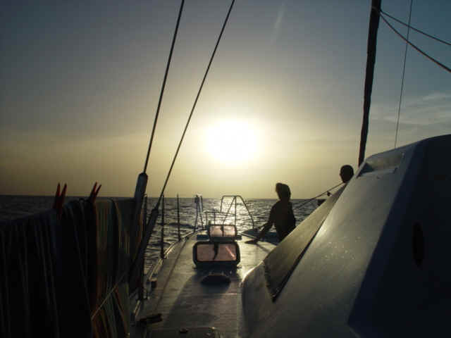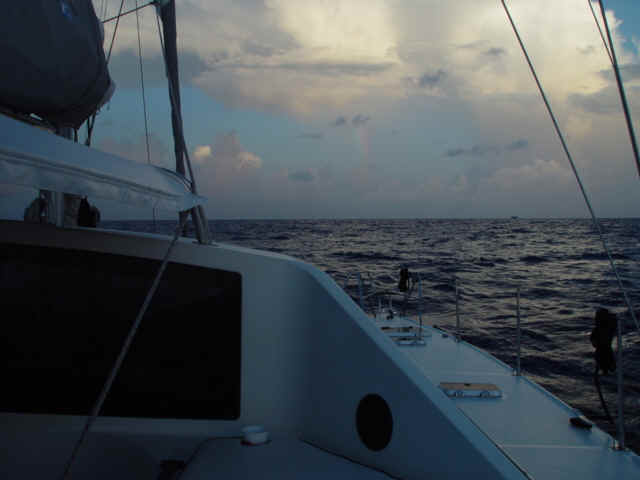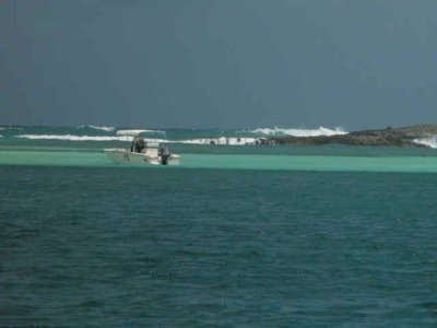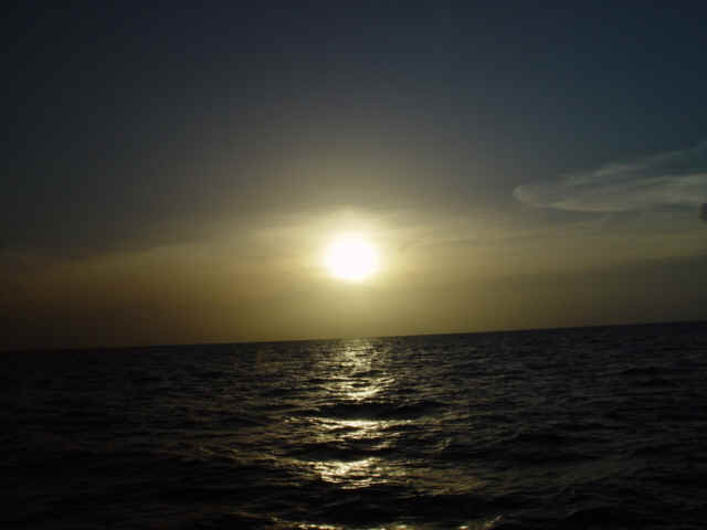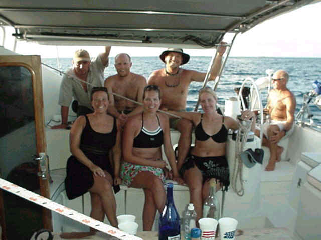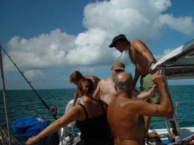 Ship's Log August 13, 2002 Woke up early to more shooting stars at 5:30 am. ETA 7am at West End. Just waiting for the sunrise so we can anchor safely. Midday - DeWayne and Vince catch 2 "huge" fish! Went snorkeling off of an uninhabited island. We had a great swim and an exceptional dinner. The island where we anchored for the night was Little Sale Cay. There were maybe 5 other boats within the crescent shaped harbor of white sand and mangrove trees. The water was calm all night and the sleeping was great. Leslie