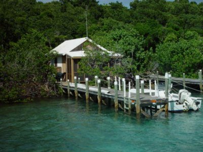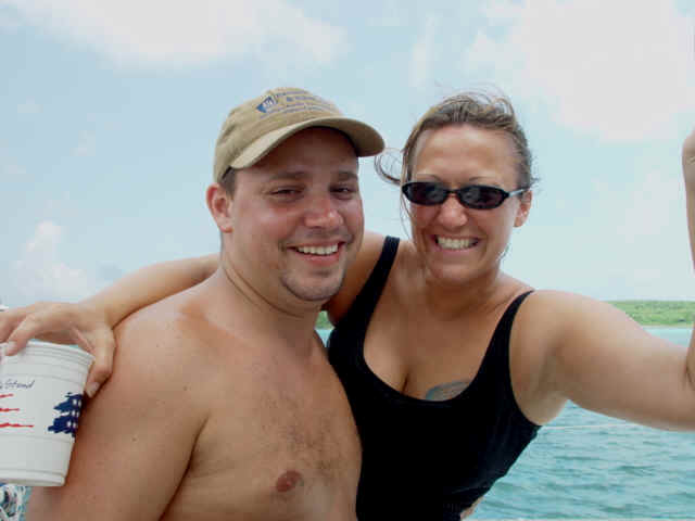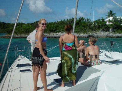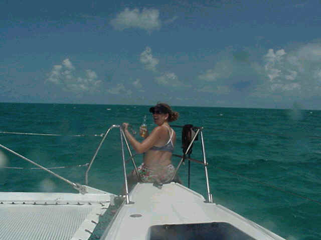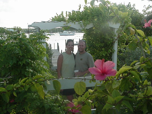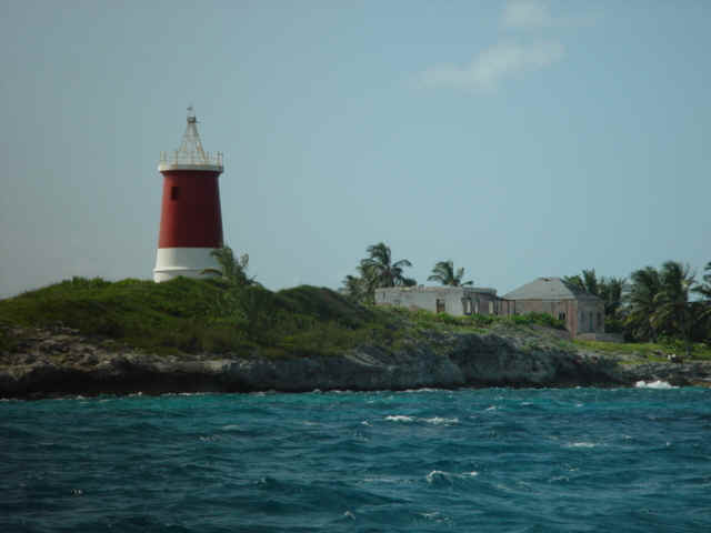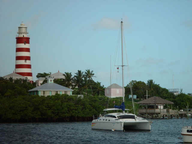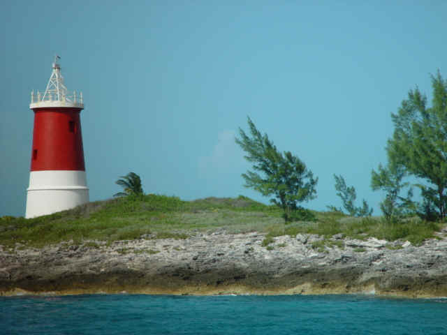 Ship's Log - August 16, 2002 We did some snorkeling off of Great Guana cay. There were white sandy beaches, starfish, conchs, sea biscuits, sand dollars, and a few fish. Another tropical paradise. We are headed for Man O War Cay and on the way we had a group of about 8 dolphin surfing in our bow waves!! They hung around for a few minutes and then headed on their way. This is exquisite, a dream come true! 7 pm - Anchored in Hopetown, had drinks and some wonderful appetizers at a hotel right in the harbor, complete with a beautiful red and white lighthouse that reminds me of a peppermint. Caught a shuttle across the island to the Abaco Inn and crashed a wedding party. (We were invited 5 minutes earlier) A couple from the US had over 100 people on the island for their wedding on the coming Saturday, and everyone we met asked us if we were with the wedding party. We said no 2 or 3 times, and then decided that it would be best to start saying "YES!". We had more food and drinks with those guys, who turned out to be a lot of fun, and then headed back to the Stray Cat at about midnight. Riding in the dinghy through the harbor at night was more than exciting ! Try avoiding 30 moored sailboats and twice that many mooring balls in the dark! We made it !! Mike