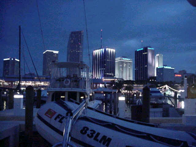 Miami Skyline from the aft of Stray Cat Ship's Log - August 12, 2002 Departed Bayside Harbor in Miami at 4:30pm. Wind out of SE @ 15 knots. Set a course for West End of Grand Bahama Island. Seas at 4-5 feet and no foul weather. Plenty of heat lightning to brighten up the sky. Also, we are right in the peak of a meteor shower forecasted for this week. It is breathtaking! Mike and Dewayne manned the helm overnight while the rest of us slept in the cockpit. Between them, they saw at least 50 shooting stars. The temperature was a perfect 72 degrees. Kate