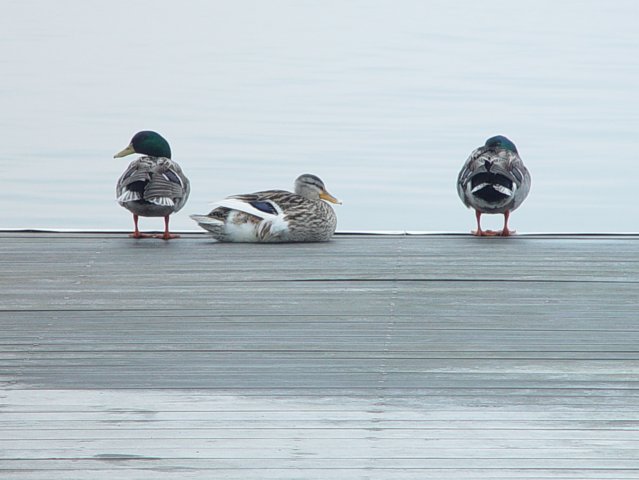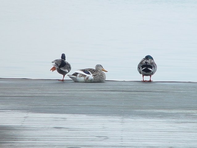 This female duck has an injured foot, and she constantly has two or three male Mallards looking after her - This went on for weeks, but it looks like she's getting better