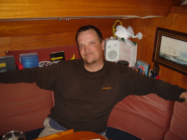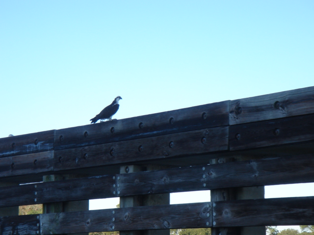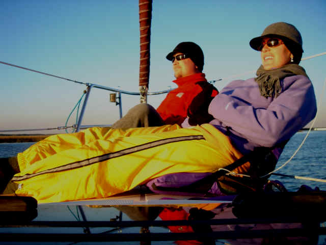 Osprey sighting as we motored under a high rise bridge out of Charleston The nest You'll have to trust us that this is a Bald Eagle, one of 5 or 6 we saw on this stretch. These are their winter feeding grounds. Kate, the Queen of the ICW Click Here to see a more reserved side of the Sailing Sheik Motoring into Steamboat Creek where we'll anchor for the night A sea of marsh grass A flock of Snowy Egrets Relaxing on the bow, taking in the sunset A view from the bow God is our pilot, Animal is our co-pilot and..... Good Night