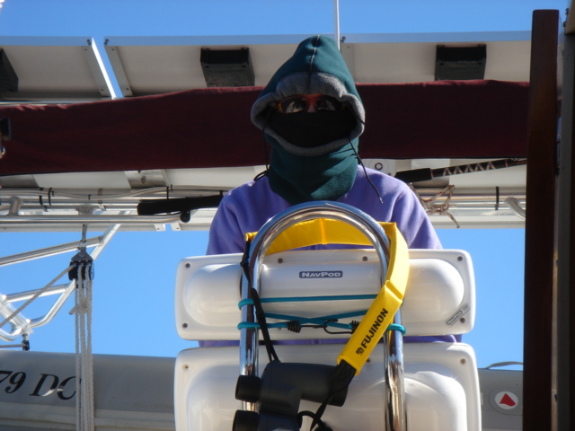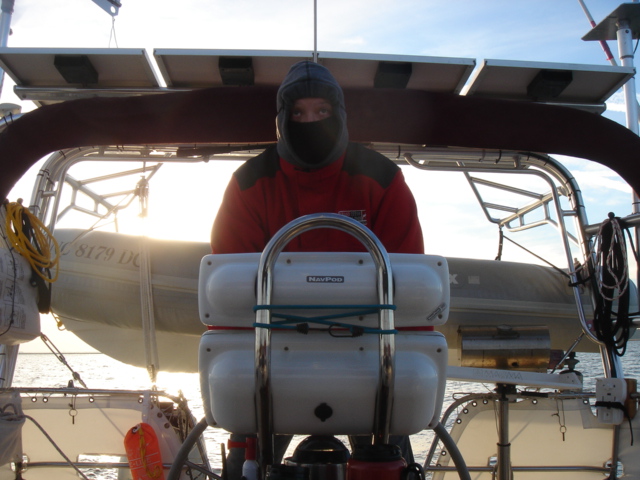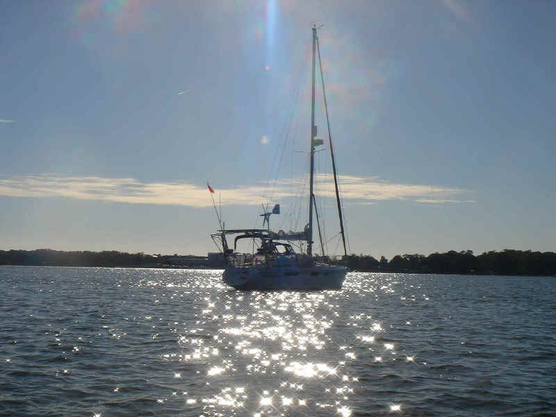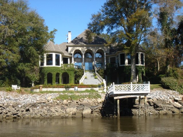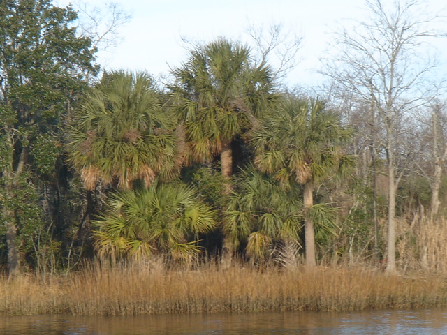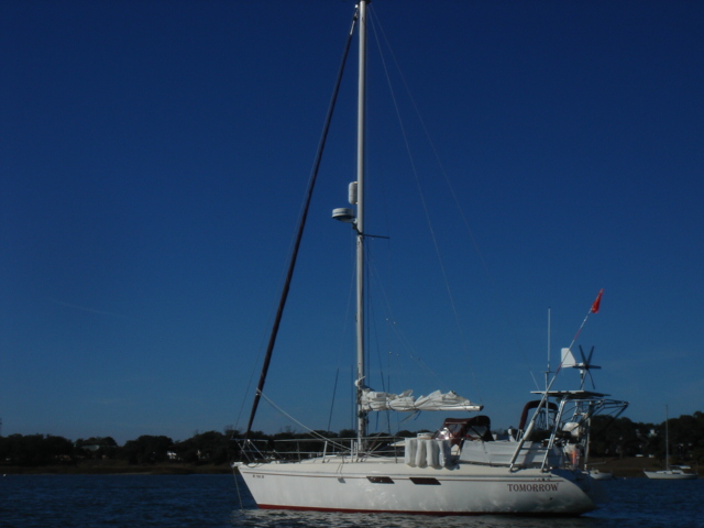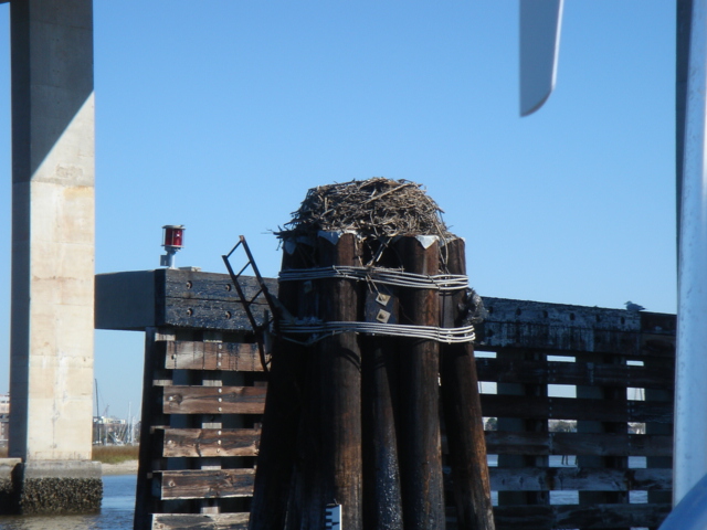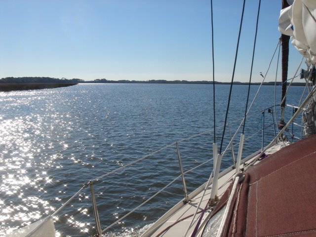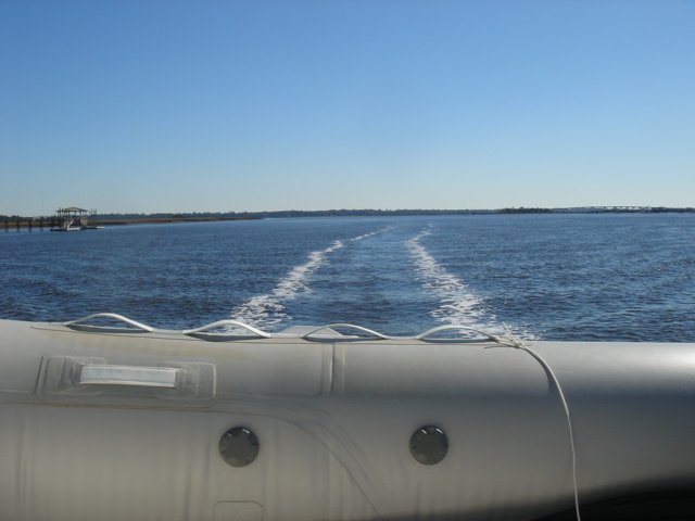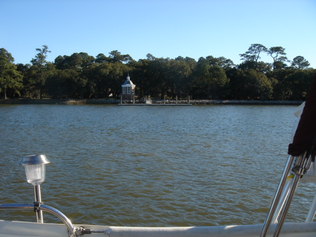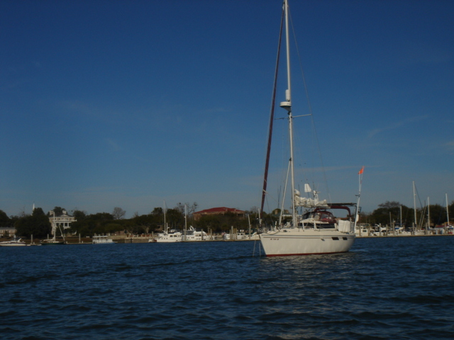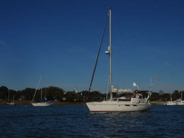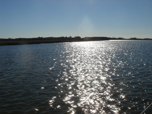We woke up this morning (Thursday, Jan. 26) planning to spend the day in Charleston. The boat was caked with salt from the off-shore passage and we needed fuel so we headed to the Charleston Marina right across the river. As we started to pull up the anchor we realized we had gotten tangled in one of the anchors from a mooring ball close by. We had to get the dinghy down of the davits while using the motor to keep the boat stationary and the tangled up anchor within reach. Mike then jumped in the dinghy and pulled himself around to the bow to untangle us. Easier said than done, but all in all, it went pretty smoothly. We then motored over to the dock for fuel. We tied up, filled up the diesel and sprayed Tomorrow down. That was a job! We then discussed continuing on, since we were full of water and diesel and clean. We decided to head down the ICW towards Beaufort, the dark side to us being from Bofort. We turned right and hit the throttle to make a bridge opening by 11am, it was quarter till. Just as we passed the bridge we saw many shore birds and a huge osprey's nest with mom and dad standing close by. That was not even the highlight of our bird watching - we happened to see a couple of bald eagles very close by as we rounded a bend in the river. Spectacular! We continued down the ICW past many glorious mansions of Charleston, their million dollar view was breathtaking, and it was our pleasure being part of the view for a while. The sun was bright and the wind was cold, but as the river narrowed every now and then the wind was totally blocked, the sun was warm and the sights were plentiful. We enjoy the nature here tremendously - there are so many things to be thankful for and the water is so captivating with the diamonds dancing on it.
