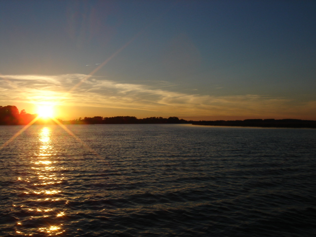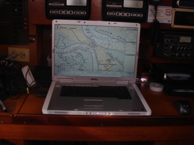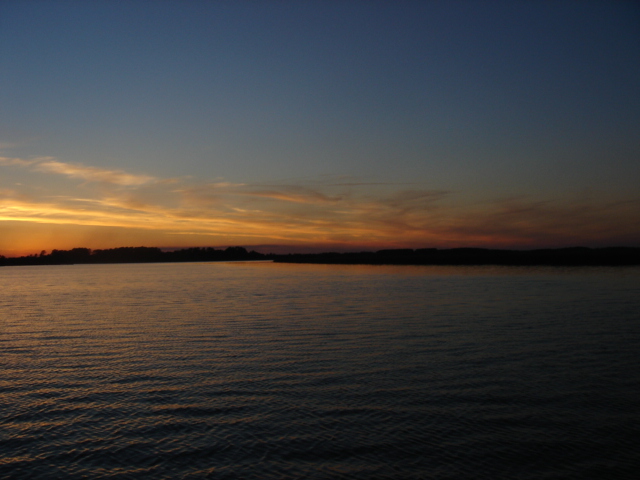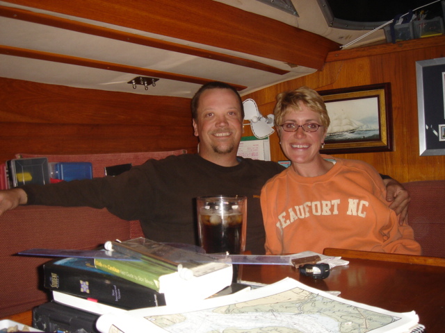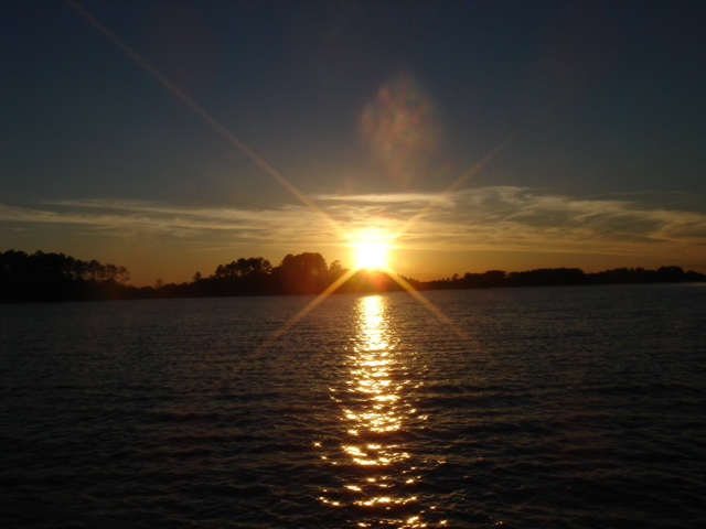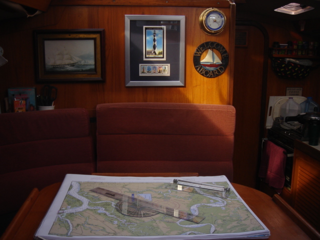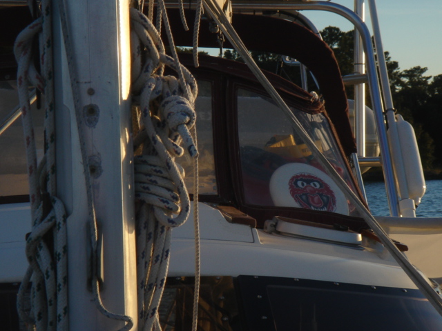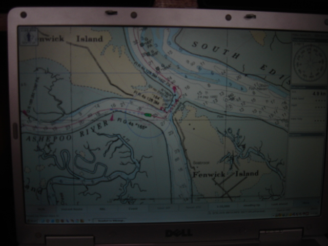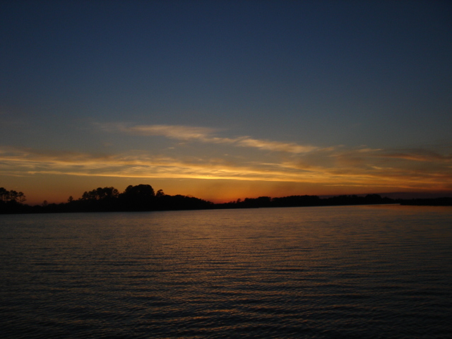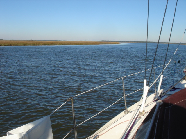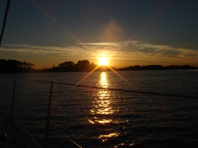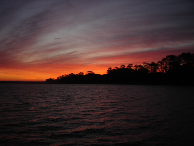 We traveled in all about 27 miles and headed up Steamboat Creek for a sheltered anchorage. The dolphins were right off our bow pulling in to the creek and the pelicans were fishing all around us. Just before sunset Mike saw another bald eagle and some babies. The quiet here is unbelievable. "Serenity now" is right, you can't even hear the water running by and we have barely seen another boat all day. This place is paradise in it's own way. I guess I would say that about a lot of places after the offshore passage the other day! We had some dinner and fixed the autopilot, Yeah!! Otto is back, and we've taken back all the nasty things we said about him. We are planning on going for Beaufort (SC that is) tomorrow. Good Night...