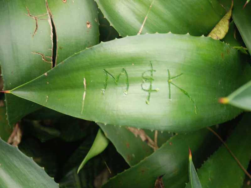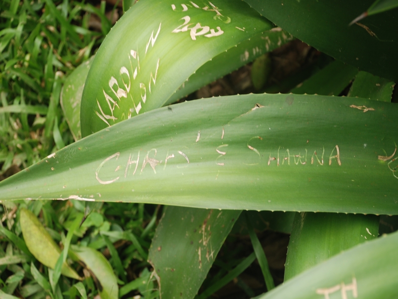 Graffiti on the aloe leaves, we had to join in M&K on the left and Stu on the right