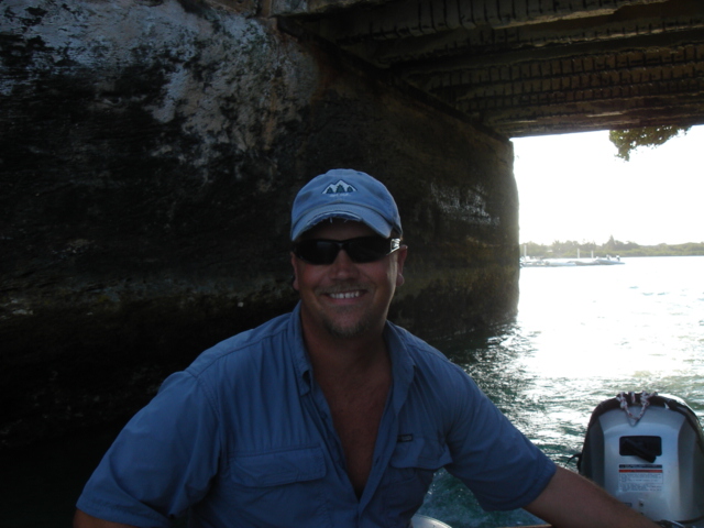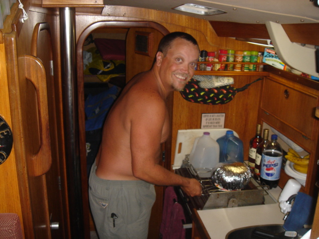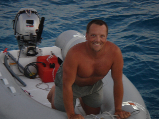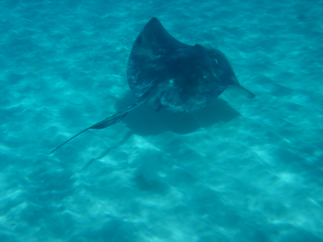 We're just one of the many boats at anchor in Georgetown Kate wearing her new shirt on St. Patrick's Day - Pinch proof Mike getting some work done at lunch - We were able to get a wireless connection from the marina for only $5 a day The marina in downtown Georgetown A group of school kids were posing for a photo, so, of course we took one Exuma Markets - The hub of cruising activity here in Georgetown Mike likes to take impromptu photos Going for lunch at Pedro's Conch Shack - The conch fritters and conch salad are so fresh that the conch is still squirming when they start to slice it up for you. The guy on the right is cleaning the conch right there, and passing it to the guy at the counter to prepare it. YUM!!!! Mt. Pedro The victims of Pedro This is located on Volleyball Beach, the main hangout for the cruisers here. This barracuda was circling around Mt. Pedro BahamasHouseboats.com This is how we usually scope out an area for snorkeling or for conch. And it's fun!! A southern stingray - Mike jumped in the water and swam with him for several minutes