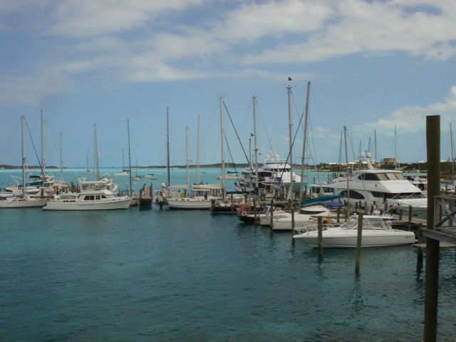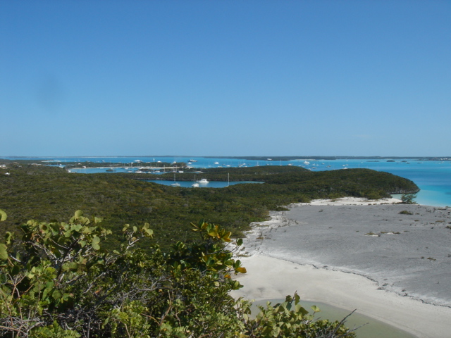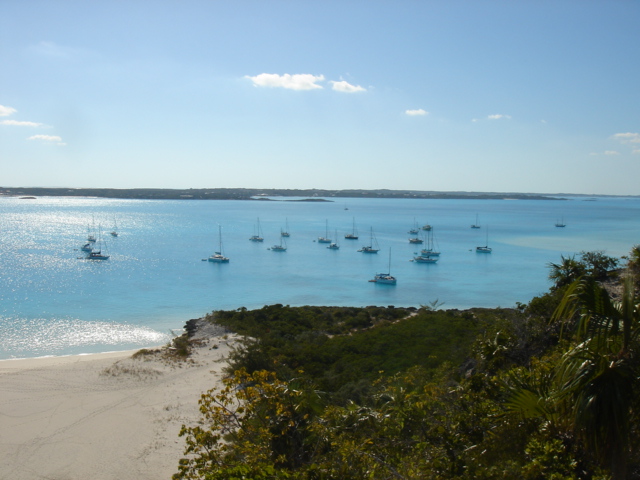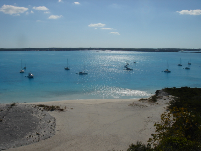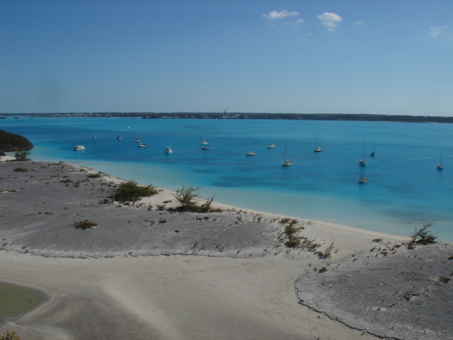 We left Musha Cay at about 6am for a 35 mile trip down to Georgetown. We were very happy that we had waited out the heavy wind and seas, and were rewarded with an easy passage on a beautiful sunny day. Soon after we engaged the autopilot, the fishing gear came out, and we dreamed of grilled Mahi for dinner. We piloted the boat along the line where the Bahama Bank drops off into the Exuma Sound. The Bank is rarely deeper than 30 ft, but when it drops off into the Sound, it goes really deep, down to three or four thousand feet. But, alas, we only caught a small barracuda. We arrived in Georgetown and dropped the hook at about 1pm, and began getting ready to go into town for provisioning. We dropped the dinghy, put on the motor, and headed out to do some grocery shopping, make some phone calls, get an internet connection, and to generally check the place out. Georgetown is the biggest of the towns in the Exumas, and is on the biggest island in the chain, Great Exuma. The people here are nicer than any we've encountered, but what is really striking is the huge number of boats here, and we got here after the big Regatta, at which time we heard there were over 400 boats and that the dinghy dock had dinghys stacked up four deep all around it. Now that we're here, it looks like there are maybe 250 boats, which still seems like a lot. This place is really like a summer camp for grown ups. There is a cruiser's net held every morning on VHF channel 72 on which anyone wishing to make an announcement can do so, and there are all kinds of organized activities, like daily volleyball games on Volleyball beach, yoga every morning at 9am, watercolor classes, bridge tournaments, potluck dinners, and all kinds of other things. Some people just come straight here and stay for 3 or 4 months, never even bothering to go anywhere else. I doubt we'll ever do that, but we'll enjoy some of the stuff while we're here. Mostly we have to stay here until all of our pre-season business is taken care of back in Beaufort, and that can only be accomplished here where there are reliable internet and phone connections. As soon as that is taken care of, we are thinking of heading east to some of the lesser known islands, before turning north for Eleuthera, the Abacos and back to the States.
