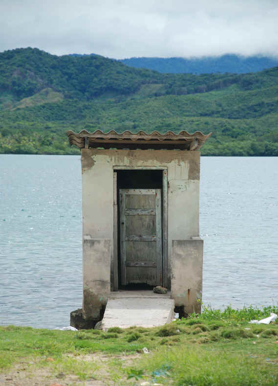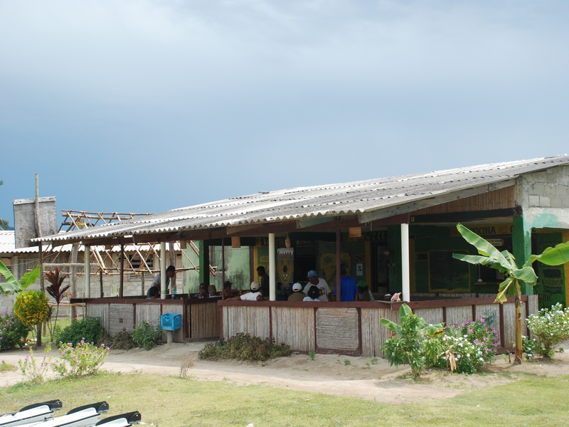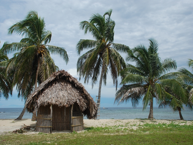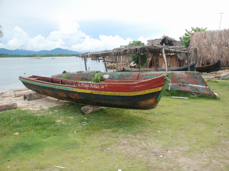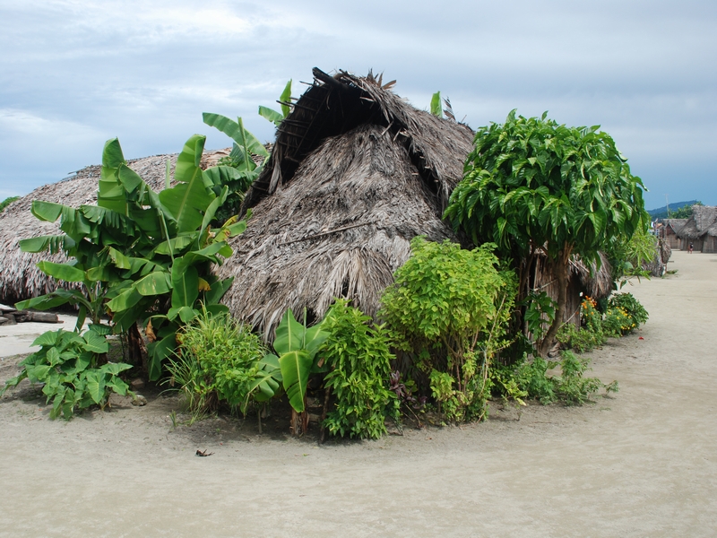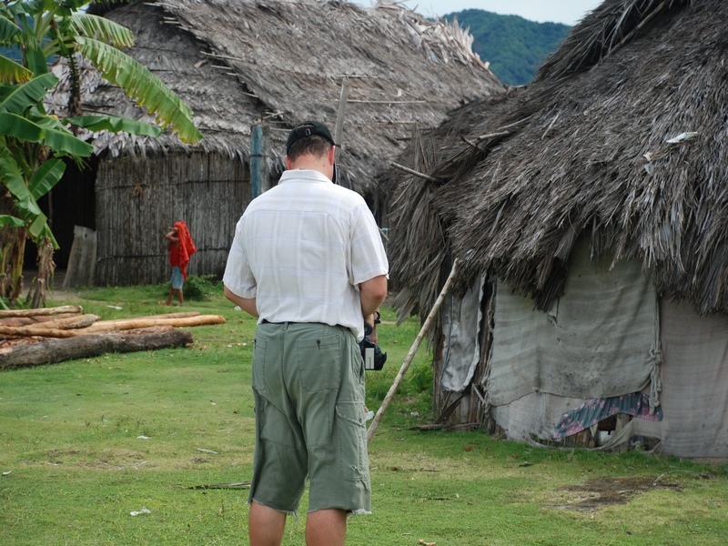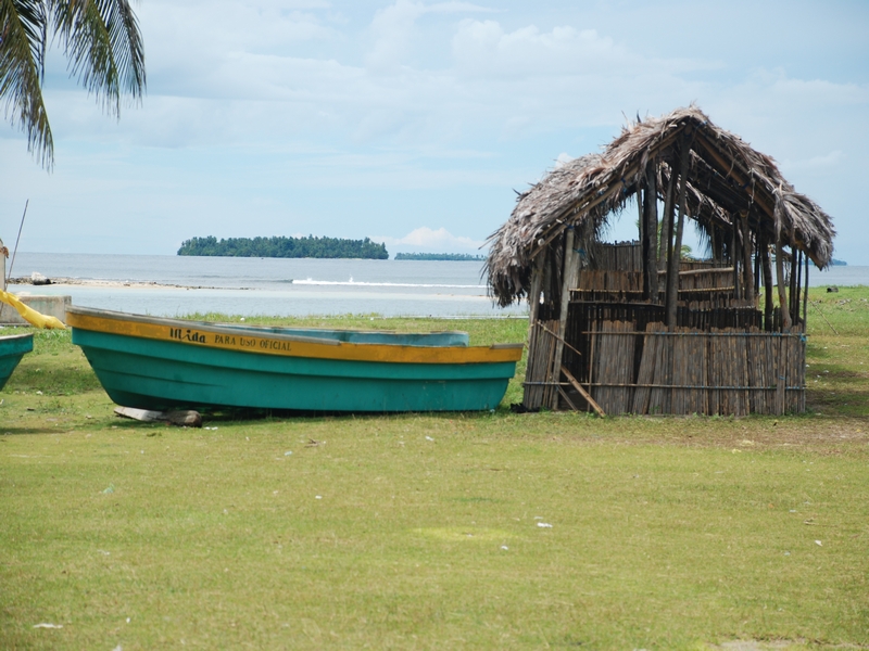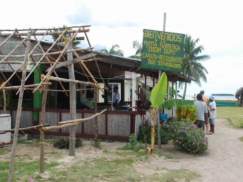We arrived on Isla Tigre right about 1pm and tied up to a small pier.  Federico took us straight to the office where we were to check in and pay our $3 per person for visiting the village.  We paid in and then sat down at the restaurant to relax for a while and order some food before heading out into the village.  We had a few drinks, ordered some lunch and went to the village with our local Kuna guide, Leonard.  Leonard knew that Federico was drunk and decided it was best for him to enter the village with us to keep us from having any problems. The village was fenced in and separated from the area where the oficina/restaurant was – it was clear that the restaurant and cabana rental operation was private and separated from the village.   They had cabanas for rent for $10 a night, a beautiful sandy beach, and expedition style sea kayaks lined up ready to be rented.  Leonard told us all about the kayaking trips that were offered and showed us a magazine article where they were written up in an adventure guidebook.