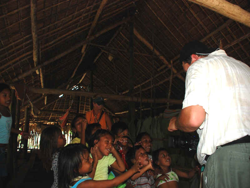 The most special thing we came across inside of the village was a ceremony for a young girl.  She had just turned 12 years old and was now heading into womanhood.  Leonard explained that it was something like a puberty ceremony, and that part of the ritual was that the girl was to stay inside of a special area in the Cultural Center that was made especially for her by the local men.  The men had specially created bamboo and palm frond walls that enclosed the area she was to sit in as the celebration continued for about a week.  All of the locals, who on this island numbered in the hundreds, would gather each morning for coffee & chocolate to celebrate.  There were dances and ceremonies held throughout the week for the young girl, with the goal of making her feel very, very special.  During the celebration, the family of the young girl provides all the meals for everyone who attends, so we soon realized that it was a very expensive proposition for the family of the young girl.  Walter wanted to film this event so badly.  We asked Leonard if it was possible to take any pictures inside of the center and he said absolutely not, that it was a sacred ritual.  But, he did talk to the grandmother of the young girl who was footing the bill for feeding the entire tribe and she said that if we bought a Mola from her that we could film and take pictures.  Walter promptly bought a Mola, and let the tape roll.  The children inside the Center flocked to Walter and the video camera.  When he played back the footage for the young children they crowded him even more.  They loved being on camera and they were hamming it up!