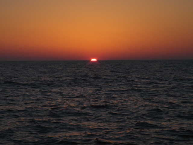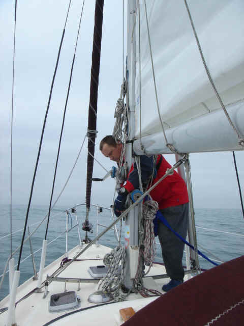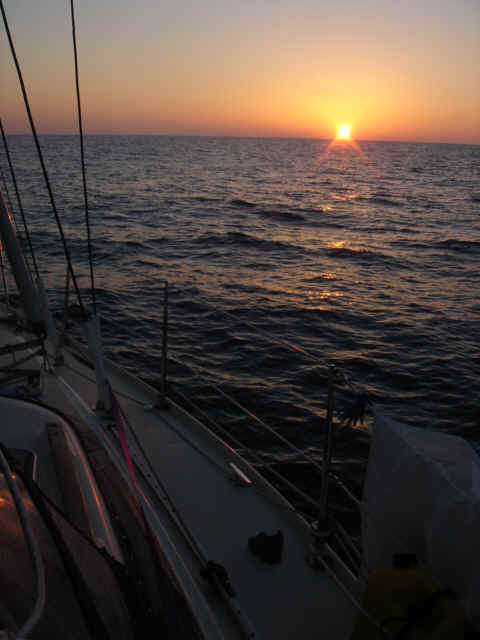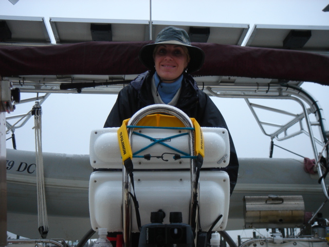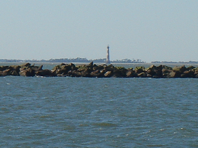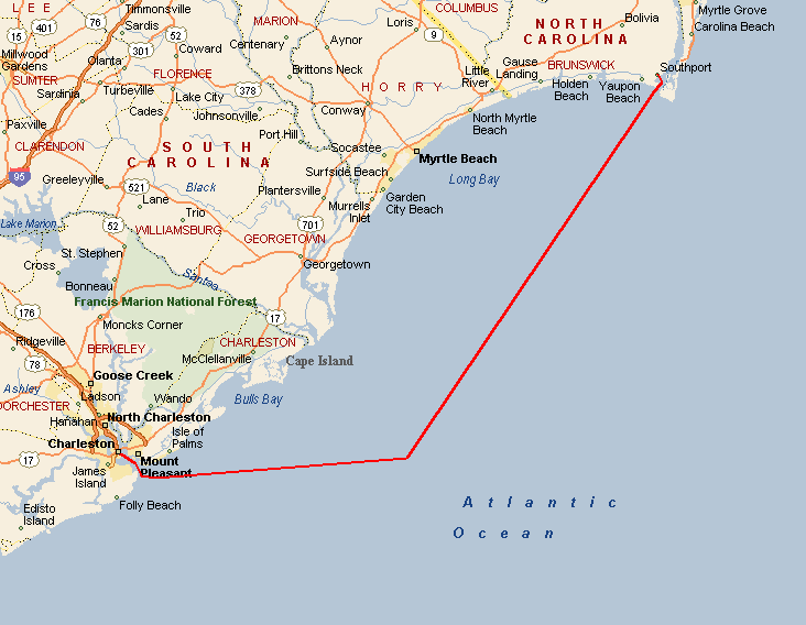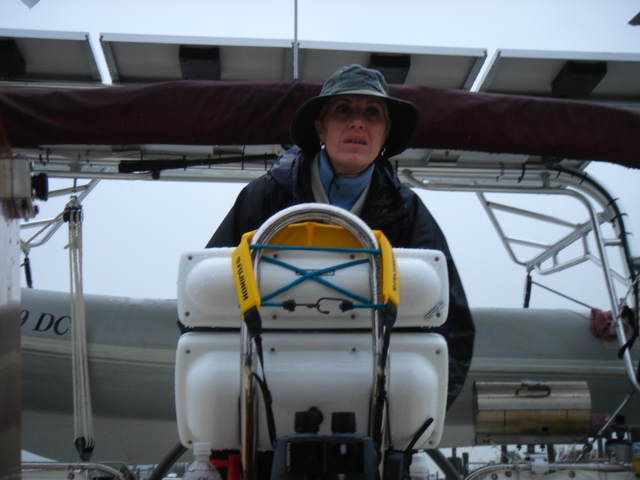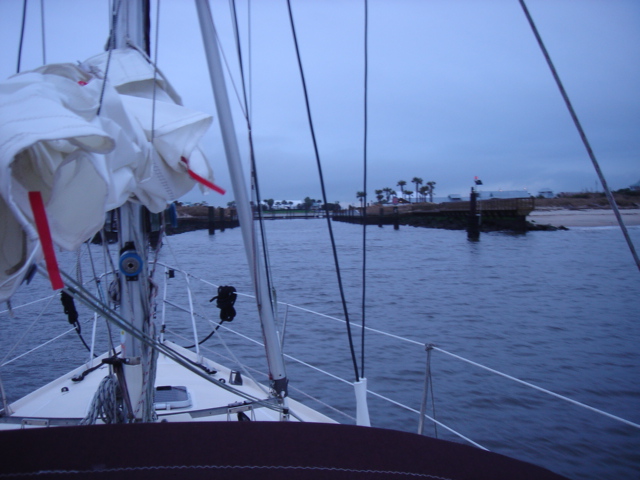 This leg started as we left our slip in Southport, NC. We motored down the Cape Fear river a short way, almost to the mouth, and then cut into Bald Head Island marina to top off our extra fuel cans and water tanks. We also used the calm of the marina to make final preparations for offshore like running the jacklines, securing fenders and lines, and lashing down the anchor and anchor locker. While this was happening, rain started falling pretty heavily - maybe an ominous sign. We motored out of the marina cut, took a left and exited the Cape Fear into the Atlantic. We set a waypoint for Charleston and set up the boat to take care of itself. The weather forecast had called for winds out of the north and northwest, but all we were getting was a 10 knot breeze from the southwest, right on the nose, so we motored for the first hour or so. Around noon, the wind clocked a bit to the west and we were able to get the sails up and motor sail at about 6 knots and half the RPMs. Everything was going as planned, and we estimated that if we kept going towards Charleston, we would arrive in the middle of the night and we really didn't want to come into the inlet at night. So, we decided to shoot for St. Augustine, another 20 hours or so, and a course change to the south. Just before dusk, a few dolphins decided to swim along side the boat for a few miles - they really gave us a show before they took off. Everything was ok until about 11pm when the wind really started to pick up. At first we were excited that the wind was filling out, but it wasn't long before the seas really started to build. The boat was starting to become unstable with that much wind so we rolled in the genny and eventually decided to wrestle down the main. In hindsight, we probably should have double reefed the main before the sun went down because when we were finally able to bring it down, the wind and seas were much too rough and it was much to dark to safely tie in a reef. So we revved Perky (our Perkins diesel) back up and resumed course. The wind and seas continued to build and the boat was really bucking and rolling. Moving around down below was a matter of deliberate balancing and firm handholds while trying to anticipate the next movement of the boat around you. We decided to check the weather and were surprised by the reports of an unforecasted low pressure system moving through. A small craft advisory and gale warning had been issued and the wind was now forecasted to build into the 20-30 knot range, and the seas were sure to build along with the wind. We were having trouble keeping our speed above 4 knots because every time we made much more than that, a ten foot wave would come along and we would bury the bow into it, slowing us back down to 2 or 3 knots. We soon agreed that a run to St. Augustine in these conditions would be madness, so we reluctantly set course for the Charleston inlet and turned the boat west, right into the wind and seas. 40 miles to safety. All through the night, the wind roared and the seas battered us. We repeatedly rode one big wave up and crashed down into the next, taking green water over the entire bow of the boat. Each time the spray was picked up by the wind and hurtled back to the cockpit where we were quickly learning to recognize when to duck in order to keep from getting soaked. Down in the cabin, the order of the day was trying not to be thrown across the boat, plotting our position on paper in the case that we lost our electronics, and continually checking the radar for freighters, which were likely to be thick in these waters around the busy port of Charleston. At about 1 am, we were both down below checking out the radar, when an alarm went off. Just a few seconds later, the boat made an unusual jolt to one side and we both looked up to see water fly across the top of the boat. Mike hurried out to the cockpit to see the autopilot display read "Boat off course". The boat was turning itself in circles and crashing into waves all along the way. It seemed that Otto had deserted us. The autopilot refused to work, so we were left with only one option - to hand steer all the way to Charleston. So there we were, in the darkness, trading 30-45 minute shifts, trying to hand steer a compass course while getting bashed from all sides by ocean waves that we could hardly see. Whoever wasn't steering was below checking the radar, updating navigation and trying to catch some winks of sleep. Against the wind and seas, we could only manage between 2 and 3 knots, which meant we were going to be at this for a long time. We just prayed that our motor, ol' Perky, would keep ticking, because if we lost the motor in this situation, for whatever reason, we'd be in a pretty bad spot. This went on for about 10 hours until we finally spotted the sea buoys of Charleston harbor. Things were much easier to handle mentally when the sun came up, and the seas calmed a bit, but not much. We were able to pick up speed to about 5 knots and the harbor began to get closer a little faster. It wasn't until 11am or so on Wednesday morning that we began the run into the Charleston Inlet. Needless to say, we were exhausted. We dropped the anchor, both took hot showers and changed into dry clothes, drank a bunch of water and went straight to sleep. We have been baptized. Mike, Kate, Tomorrow and Perky (Otto got scared and quit) We set out from Southport, stopping into Bald Head Island to take on fuel and water before the leg to Charleston Old Baldy Exiting the inlet at the mouth of the Cape Fear River Let's get it on Waiting for the action to come This is "Pirby" - our EPIRB - Emergency Position Indicator Radio Beacon - Let's just put it this way. If it comes down to it, Kate will probably save Pirby before she saves Mike or the boat. Holding on to this means that a young, fit, Coast Guard recruit will jump out of a helicopter to save your cold wet buns. Right before sunset some dolphins came to play. Click Here for Dolphin Vi