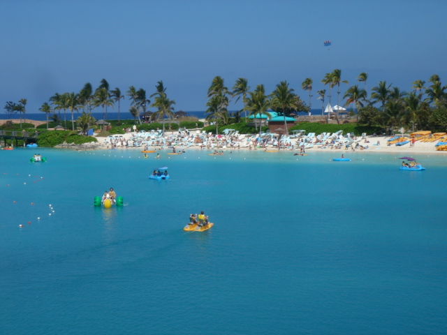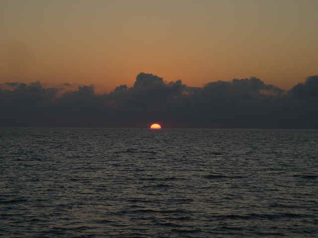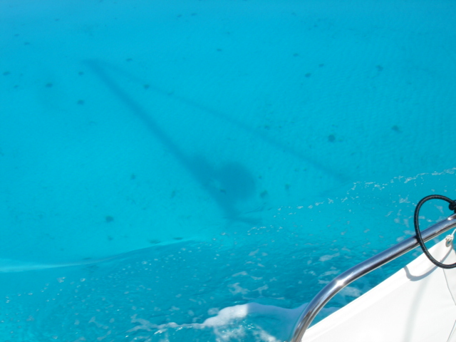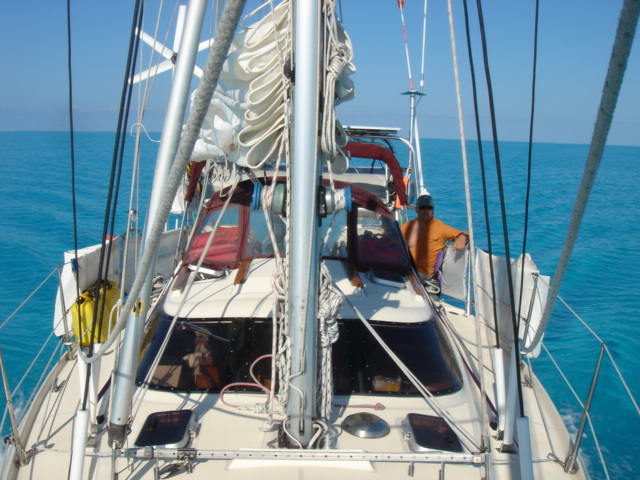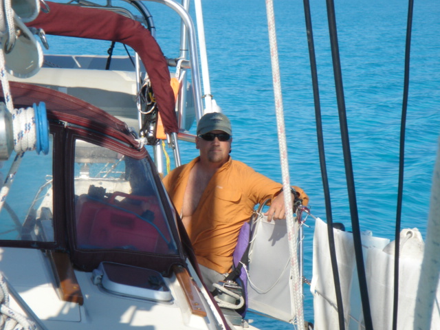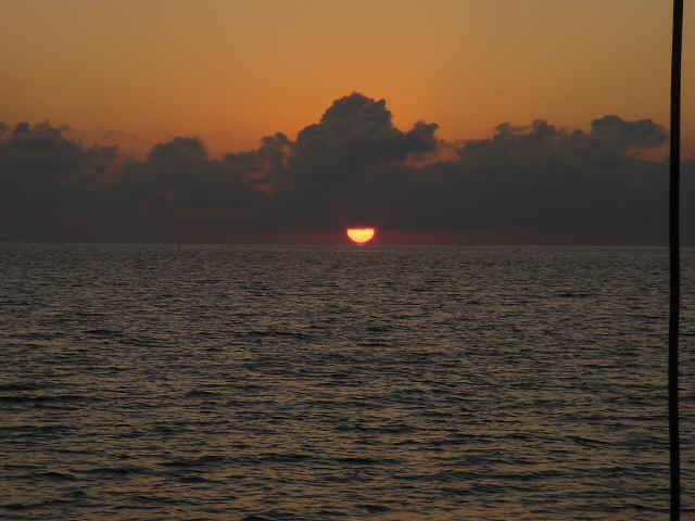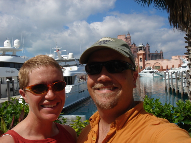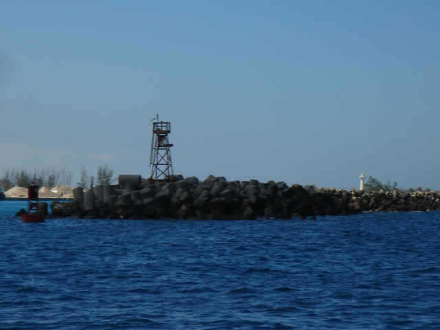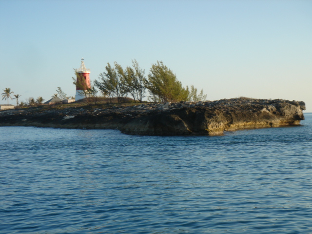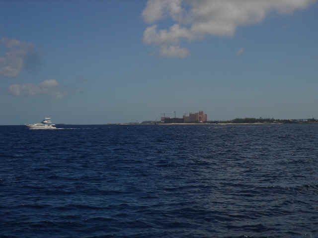 We cruised out of the Dinner Key channel and headed across Biscayne Bay, past No Name Harbor and again out into the Atlantic Ocean. The sun was setting as we started to feel the effects of the Gulf Stream. It wasn't long before the dreaded cruise ships were all around us, the seas were confused and were churning us quite a bit. The cruise ships are the worst thing to deal with because they keep their decks brightly illuminated, obscuring their running lights. As a result, it's difficult to tell which way they are moving, or even if they're coming directly at you. Kate did not feel so good and Mike was on watch by himself by 8pm. He dodged many freighters and cruise ships and took care of the most stressful part solo. Kate took watch by 11:30pm. Just before Mike went off watch, however, he came up into the cockpit to see a huge orange light dead ahead that wasn't there just a minute before. He dashed below to check the radar, and to his surprise nothing was showing. He jumped back up into the cockpit to try and figure out what the heck it could be. Kate went to look and the huge orange light had exposed itself even more. It was the moon! We had a good laugh over that one. Really though, it is magnificent to see the moon rise on the water - it is huge and bright orange. Another view into God's incredible imagination. During Kate's watch, the seas had calmed and there was not much traffic to speak of. Mike got up about 2:30am, we had made great time and were already close to Gun Cay. We found a good spot to anchor on the west side of Gun Cay on the charts and started making preparations for the approach. Mike mans the helm while Kate navigates with the computer software down below. We anchored among other boats in 10 feet of water at 3:15am The water was crystal clear and a beautiful ice blue color. We crashed out for 3 hours, Mike slept in the cockpit to keep an eye on things. We rose at dawn and weighed anchor early. We headed out for the Northwest channel to Chub Cay. The day was the best that we have had on the water so far. We could not keep the smiles off our faces. Bathing suits, sunscreen and even a little sun burn aaahhhh! The Bahama Bank is about 12 feet deep the whole way across. We were mesmerized by the sandy bottom, littered with large brown starfish, coral, nurse sharks and loggerhead sea turtles. We saw shrimp dancing on top of the water, flying fish and at sunset whales. We are not sure what type yet. We both rode on the bow for a while, read a lot and listened to some great music thanks to Mike and XM radio. By sunset we had come off of the Bahama Bank and into the Deep Midnight blue colored Tongue of the Ocean, which is 1000's of feet deep. We made it to Chub Cay in the dark about 7:30pm. There was a coral reef just to port of the entrance, and the range to guide you in was not lit. It was a little hairy, but we kept our heads about us, and slipped right into the channel. The boats at anchor inside the harbor were not in the anchorage that we saw on our charts, so we decided that they must know something we didn't and in the pitch black we maneuvered in among them. We set the anchor and kicked back with a little Capt. Ron. (It's a movie, not a rum) One of the best sailing movies ever! We have watched it over and over. We crashed early and got up early. We had the motor running before dawn and we were heading out of the channel by 6:15am. More big smiles today, Presidents day. We are again in the deep and cannot see the bottom. We should enter Nassau around 2pm. Mike will have to go check us in at customs and immigration before we do anything. We can see the islands becoming an addiction. Monday, February 20th We arrived in Nassau at 2pm and cleared customs and immigration at 4pm. We had to take a slip to get cleared in by customs and decided to keep it due to the poor holding ground at the anchorage in the harbor. Only the Captain may leave the boat until the officials arrive, so Kate had to stay on the boat and keep busy until then. As soon as we cleared customs, we pulled down the yellow quarantine flag, raised the Bahamas courtesy flag and set out immediately for the shops across the street. We saw first hand what we knew to be true, that items are much more expensive in the Bahamas. Food is double what you would pay at Wal-Mart, especially meat or chicken, and the home goods, decor, kitchen utensils etc.. are sometimes 5x more expensive here. There is an import tax of 33% that the Bahamian govt puts on imported goods so that people will buy local whenever possible. They do not have income or sales tax either and those are built into the price. Liquor and jewelry are less expensive than in the states and there are numerous stores on every block. There is a pool at the Yacht club which we have taken advantage of and have met a lot of really nice cruisers on the docks. We did get an internet connection at our Marina, the Nassau Harbor Club. We decided to stay another day to take in the sights and go to Atlantis, the mega resort on Paradise Island. We had a great dinner of grilled chicken breasts and Israeli Couscous, our friend Paul turned us onto it and we had to provision at the Fresh Market in Coconut Grove, a specialty foods store that had everything! Anytime you come across the Israeli stuff go for it! Unfortunately they only had one bag. Mike planned our next passage to Allan's Cay. We did find out that a cay is an island of less then one mile in length. Allan's Cay has lots of coral reefs for snorkeling, also Leaf Cay nearby has a unique population of iguanas that come right out to you when you land your dinghy. We crashed soon after dinner and planned on seeing Nassau the next day. Tuesday, February 21st Did a little sightseeing around Nassau today. Not necessarily what you think of when you think of the Bahamas, but unfortunately, it's what most people who only travel on cruise ships get to see. The downtown area near the cruise ship dock is very commercialized,