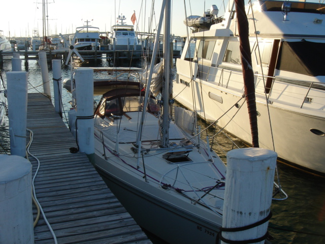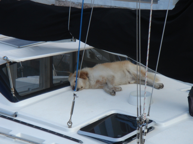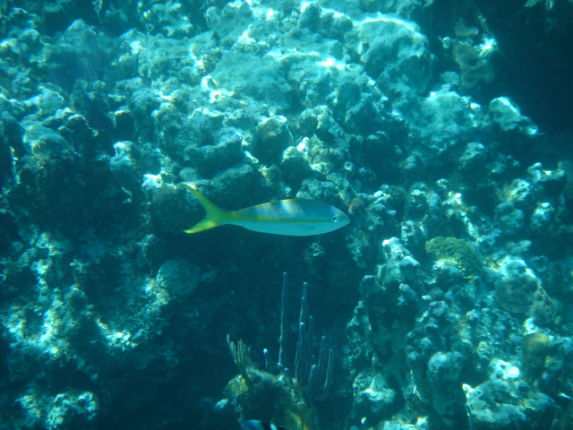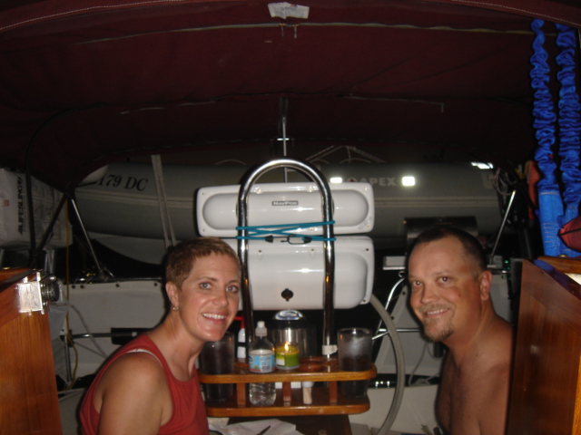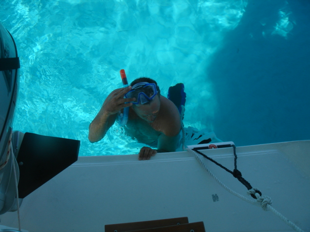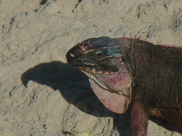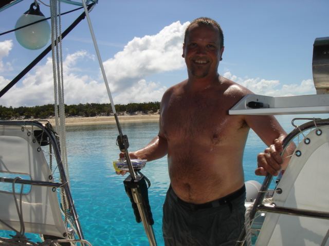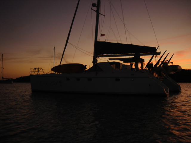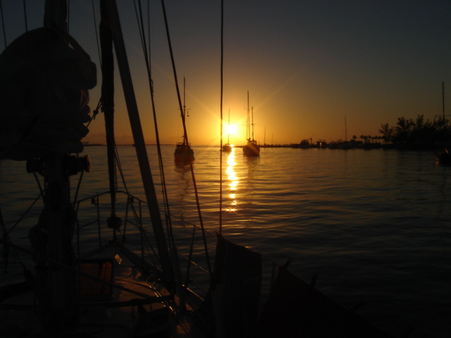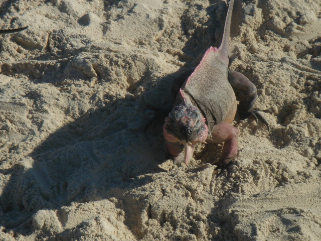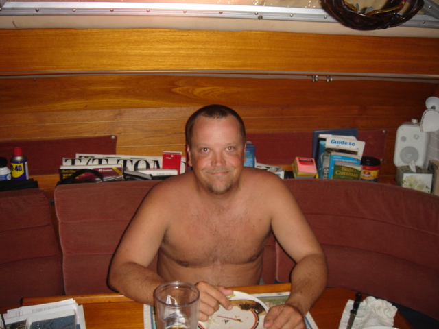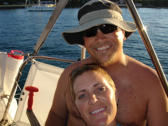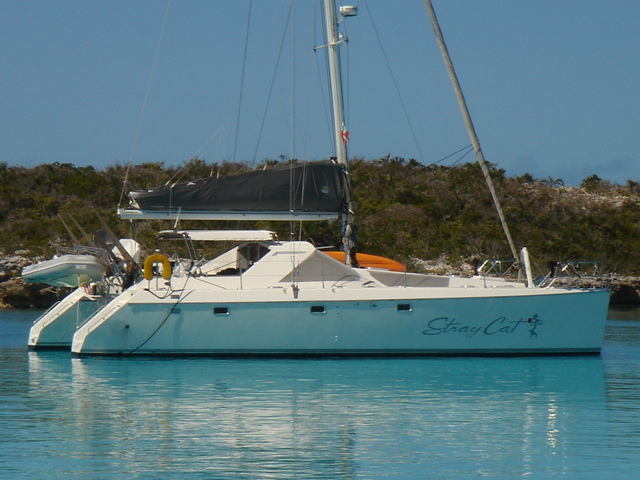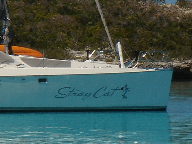 Wednesday, February 22, 2006 Nassau Harbor We decided to spend another day in Nassau because the forecast was for winds from the south/southeast, exactly where we were heading. We wanted to do some sailing to Allan's Cay and the wind was supposed to be better on Thursday. We are filled up with fuel, water, groceries, movies, books and anything we could think of to get. Including the Supremo which we found at the local grocery store. We had this stromboli type of food at our wedding. It is one of Mike's all time favorite foods and we can no longer get it and thought that we would never see it again. We were able to get it back then straight from the wholesaler, a company called Stefano's. There are only a few places in the Exumas to shop for groceries, and they will be even more expensive than Nassau, which is the biggest town with the most goods and services anywhere in the Bahamas. Thursday, February 23, 2006 Allan's Cay We left Nassau harbor just before 9am. We would have to cross the Yellow Bank which is full of coral heads, and to be able to navigate by sight, the sun has to be high in the sky. Because of this, it is not recommended to leave earlier than 9am. We were underway for two hours before we got to the Yellow Bank. There were lots of coral heads. None were sticking up out of the water, but our draft (the part of our hull below the waterline) is 5ft 6in. We had to be careful and steer around the really dark long patches of coral beneath the waters surface. The entrance to Allan's Cay has a coral reef on one side of it and as you enter the water on the inside of the island there is a long shoal that runs right up the middle. We use computer software and GPS to navigate. Our computer software charts did not have the entrance to Allan's Cay properly marked, so we used our paper charts. Once inside, we found a spot of deep water among a few other boats, and dropped the hook. We saw the iguanas on the beach from the boat and quickly lowered the dinghy to go and investigate. A tour from Nassau called Powerboat Adventures pulled up while we were getting the dinghy down. There were two boats, each with about twenty passengers and each sporting four 200 HP outboards. Side by side, they beached the boats, blew their horns and the iguanas came running. They had oranges for them and 2 boatloads of people who were more than anxious to feed the iguanas and take a million pictures. They took off as quickly as they had come and we had iguana beach or Leaf Cay to ourselves. The iguanas at times seem aggressive, they run straight up to you, but only to keep the other iguanas at bay. Then they'll run back and chase off others as they get closer and closer to you. Mike had read that the rock iguanas do not have very good eyesight and that it's not a good idea to feed them by hand because they could easily mistake your hand or fingers for a morsel of food. No Problem! You almost felt like, as a group, they could overpower you if they had wanted to, there were so many of them! Kind of like Hitchcock's The Birds. We went back to the boat and snorkeled around it a bit, cleaning the waterline of the boat, and examining the bottom paint, prop, zincs and rudder. We both took showers and changed clothes. Kate went out to hang some laundry on the line and lo and behold, there was StrayCat, just off our port side, preparing to drop anchor. Our friend Capt. Mark had hailed us on the VHF just as we dropped the anchor at Allan's. We were excited to hear from him, and told him where we were. He had just finished a 2 week charter and was returning from South Andros Island, where he was dropping off his guests. He had received an email update from us that morning that said we were leaving Nassau for Allan's Cay, so he made a minor course change and was sailing to Allan's hoping to find us there. By the time we talked on the VHF, he was only a couple of hours away. It was great to see him since we had missed him in Miami. What a beautiful place and pretty cool to be able to share it with a friend. We had dinner on Mark's boat and he loaded us down with salmon, chicken, and tenderloin left over from his charter. What a great friend! He is very generous and smart. We have a great time with Capt. Mark. Friday, February 24, 2006 Allan's Cay We had coffee with Mark who told us about a great coral reef right around the corner. (He failed at that time to tell us the last time he had been on the reef, a hammerhead shark swam right by him). That was a good thing. We suited up, grabbed all of our snorkel gear and the underwater housing for the camera, so we could take pictures underwater. Mark told us that the coral reef used to have moorings on it so people would not anchor on the reef. We dinghied over and did not see any moorings, but could tell that there was a big reef and we could already see the fish. We anchored the dinghy and Mike jumped in to inspect the current etc... Just before he did he informed me of a barracuda on the reef. Oh Great! Just what I wanted to hear. I told him to keep those things to himself. I had been trying to get myself calm for the nurse sharks that are everywhere and now another danger?! We swam over to the reef and dipped our heads below the water. There was a sea of tropical fish and corals. So many different varieties of both. We soon found the old mooring submerged about three feet under the water. It was a cool piece of history. We swam all over the reef until Kate broke her mask and we had to go back to the boat for a spare. Thank God for spares! You should have an extra everything if you can fit it. Things are too inaccessible here and you sure don't want to be in the Bahamas without a snorkel set! We grabbed a snorkel and the Hawaiian sling for fishing. There is no spear fishing in the Bahamas using anything with a trigger mechanism, so the way to do it is with a Hawaiian sling. If you saw the Survivor with Rupert, that's what he was using to catch fish. We went around the West sid