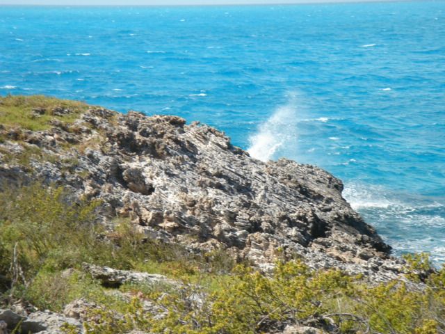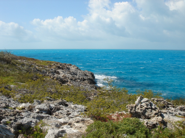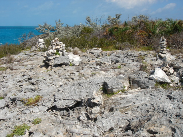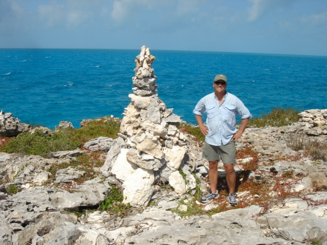 Stray Cat at sunset Fresh and clean after a great day of snorkeling! I love it here! The next day, we dinghied over to this beach to relax for a while, but the iguanas wouldn't leave us alone. It's not very relaxing to have twelve or so iguanas 5 feet away staring at you. So, we took a picture and left for another small beach just opposite the boat This was renamed, M&K Cay - Our dinghy in the foreground and Tomorrow in the background What is stress? There were huge conch shells all over - Someone had a conch feast for sure A pile of cleaned out conch shells These little birds were very curious, and probably willing to take a handout We hiked up a little trail to the top of Allan's Cay where there were several cairns built out of the local rocks These islands are made mostly of limestone, and it has worn itself into a never-ending series of crevices, cracks and caves - all with razor sharp edges You do not want to fall down on this stuff - it would definitely slice you open But, the view is pretty nice The wind was really up this day, and crashing the waves against the island Luckily, we were anchored snug as a bug on the inside M&K Cay Hiking back down to the beach One of the tour boats that occasionally stopped by to deposit their guests on the iguana beach for a little thrill