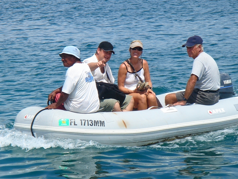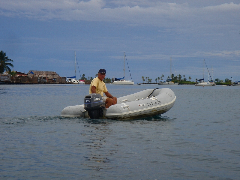 Walter, Federico & Capt. Mark in the dinghy on their way back from a shopping trip on Corazon