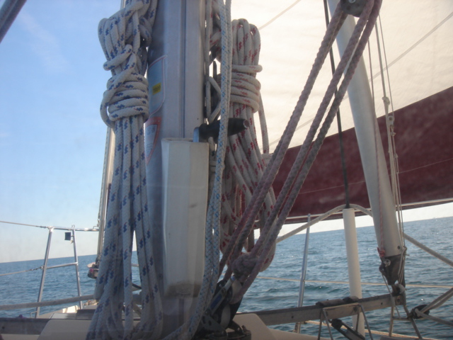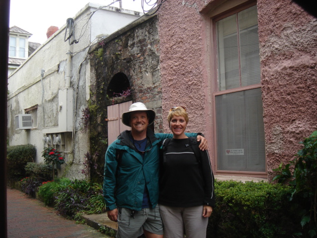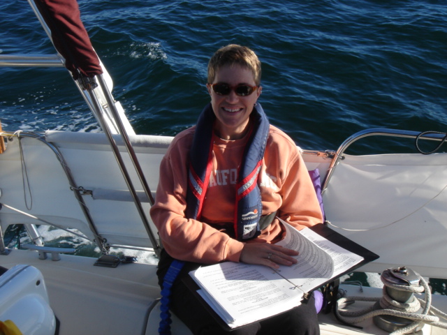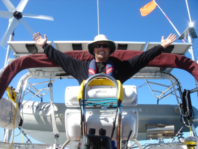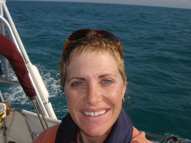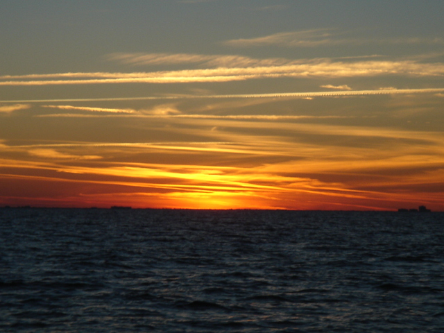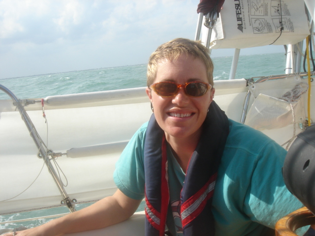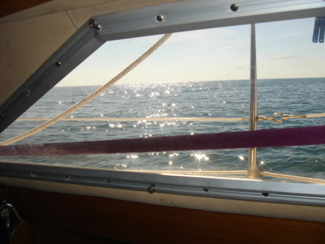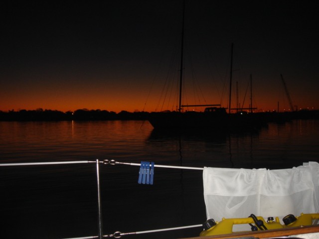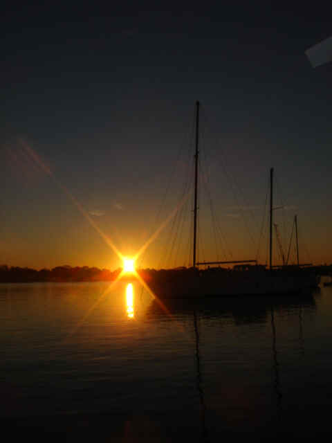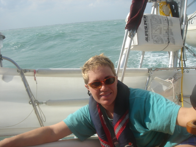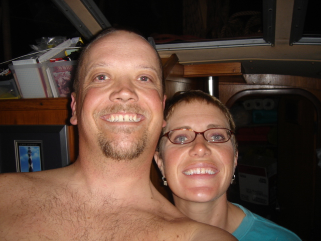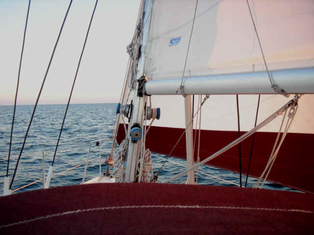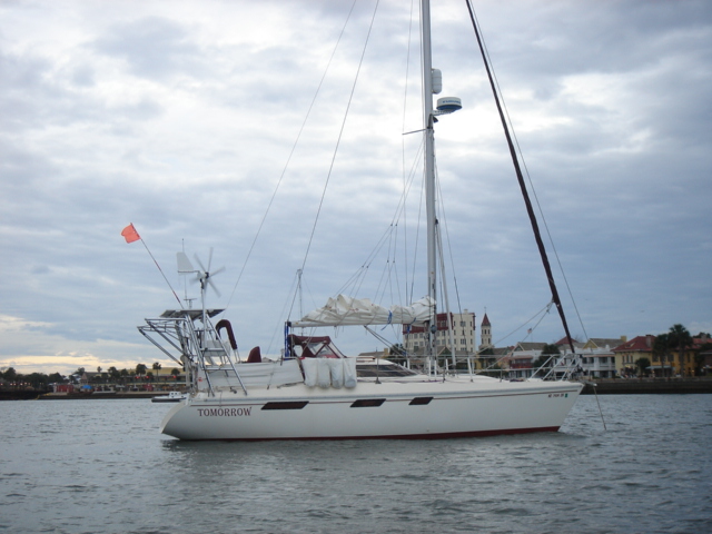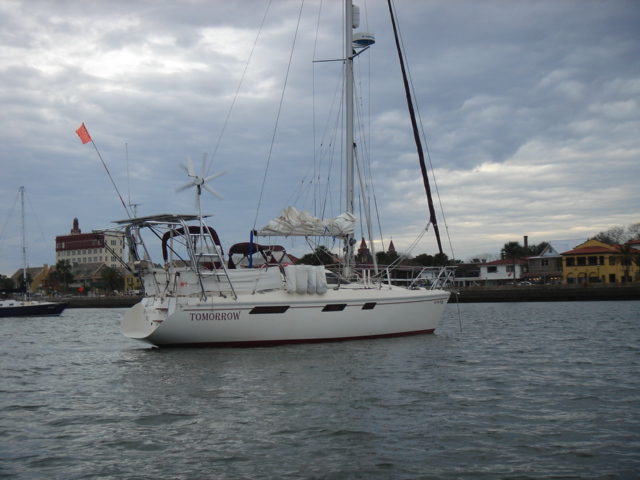 A Model A in the entrance to the five-star Casa Monica Hotel in St. Augustine Flagler College The outside of the Casa Monica Kate and Mike Kate's new apron - She can now cook with reckless abandon This dolphin visited us in the anchorage Sunrise on the morning we left The St. Augustine lighthouse as we sailed away Some studying while underway Going south make me happy Full sails Let the sun worshiping begin Click Here to see what the view from the bow is like Kate doing some reading on the foredeck Hey look, a turtle head poking out ! - We saw several sea turtles on this leg Look Ma, no hands - Otto did great Click Here to see Otto in action Mike catching some sleep before the night shifts begin Kate was on the sunset watch The sun went down and the moon came up This is one of the cruise ships we had to dodge near the Port Canaveral entrance - The Disney liner came within a quarter mile, which might not sound like it's very close, but let me assure you, it's too close for comfort. Mike adjusting the dinghy. The lines were slipping and stretching when the weather got rough, and it took some huge effort to get it back under control The view from the companion way into the cockpit The sun is up and we're still alive! This sailboat seemed to be trying for the Bahamas - We thought he was crazy And, we were right. It was only a few hours later that he gave up and we saw him behind us beating towards the Ft. Pierce inlet. After we negotiated the inlet, we thought about sitting around and watching him try to make it in, but our anxiety to get the hook down won out. Mike started to get used to the rough ride and actually enjoy it. Click Here for a sample of the sea conditions #1 Click Here for a sample of the sea conditions #2 Hold on Katy ! I don't know why I love you sometimes!