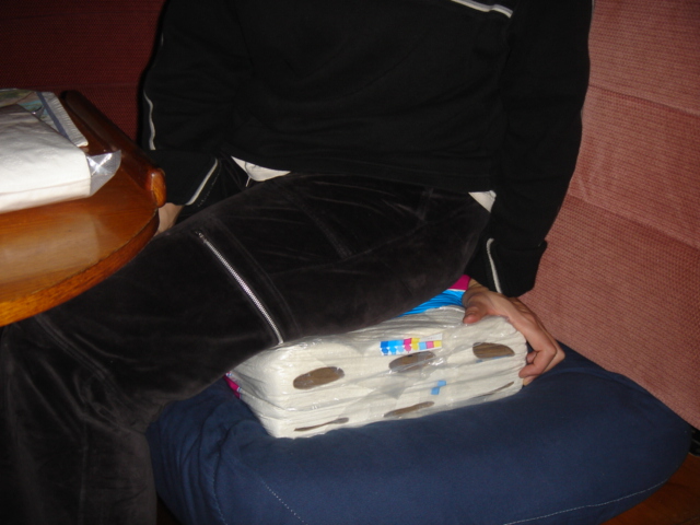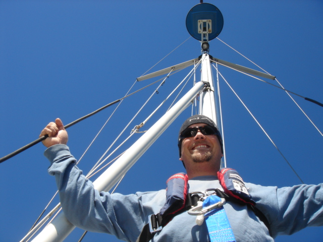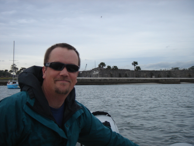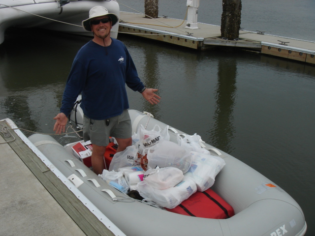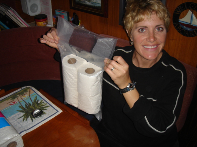 Waiting for our taxi to West Marine and Wal-Mart Waiting for our taxi after Wal-Mart - Two full carts baby! Unbelievably, we were able to pile it all in the dinghy Knee deep in provisions Our anchorage in St. Augustine - Right in front of downtown and the Fort Mike and the Fort Sunset over the downtown This osprey found a nice fishing spot on the spreaders of an adjacent sailboat We've read that vacuum sealing toilet paper reduces the amount of room it takes up, and when you're cruising in other countries, soft and friendly toilet paper is like gold. It worked! We ended up finding an easier way though Tonight was the night for haircuts. Miguel did a FABULOUS job ! THUPER !!!! Freshly trimmed
