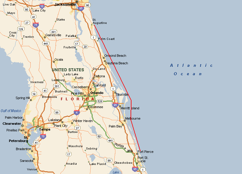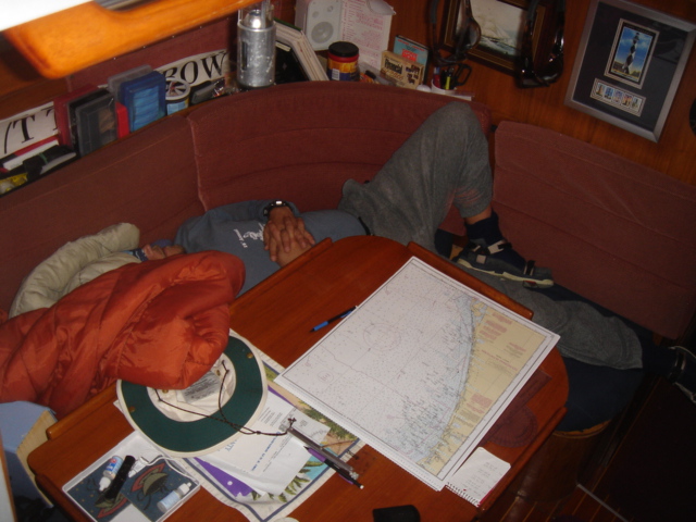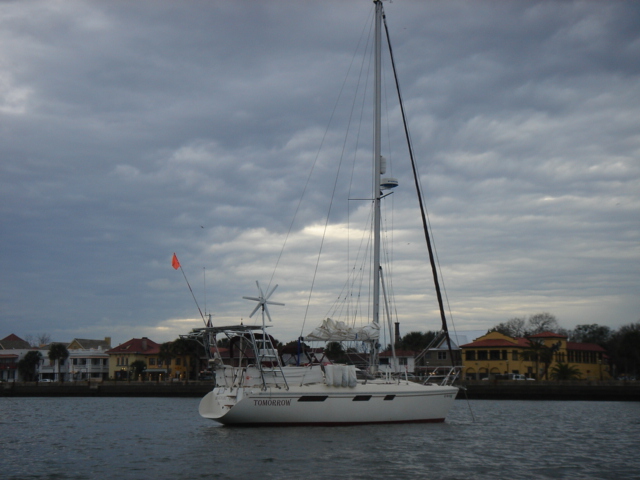 Thursday, February 2, 2006 (Groundhog Day) We spent a day or two in St. Augustine waiting out a cold front that moved through, and used the time to do some repairs, get some rest and do some provisioning at the King of all provisioning places, Wal-Mart. We've been to St. Augustine many times, but it was nice to walk around the Historic District again and we even saw a few things that we'd never seen before. The weather forecast came together for Wednesday morning, so we set out from the St. Augustine Inlet on Wednesday at about 9am. The sail through the day was great, just as expected with 1-2 foot waves and 5-10 knots of wind, and we were visited by several sea turtles, lots of dolphins, and the usual gannets and pelicans. The sun set as we were rounding Cape Canaveral and in the darkness, as always it seems, is when things changed. At about 2am, the wind started picking up speed and the waves and swell followed suit. In the middle of this, some of our boatyard work was put to the test. Mike looked down at the gauges to see that the fuel vacuum gauge was showing a high reading, so, we switched into filter change mode. Thanks to the extra Racor filter we installed in parallel, the change was easy and everything went just as we planned. We switched the valves to the other Racor, changed the filter element in the primary filter, and switched back, all without ever shutting down the motor. Click here to view the installation of the Racor filters. The vacuum gauge returned to a normal reading, and we continued on our way, very satisfied with the work that we had invested in that system. If we hadn't made that modification, the motor could've easily shut down without warning. We would've been drifting helplessly, while making a filter change and bleeding the fuel system, as we were getting abused by the gathering wind and seas. We couldn't help but be happy about the small success of our fuel filter modifications. By the time we were dodging freighters and cruise ships entering Port Canaveral at 4am, we were dealing with 20-25 knots of wind and 10-12 foot waves. We traded watches throughout the night, the other trying to get some sleep. Otto was a steady hand at the helm, and our confidence in him is returning. The sun came up on Mike's watch, and as always, it was a welcome sight. We were slowly making way to the Ft. Pierce inlet, but the heavy wind and seas on our nose were slowing our progress to 3-4 knots (that's about 3-4 miles per HOUR), so not only were us and the boat being abused by the succession of now 15 foot waves, but since all that was slowing us down to half our normal cruising speed, we would have to do it for twice as long. As a result of all this, the fuel in our main tank was below the 1/4 mark, and lower than we had ever let it fall. We weren't sure just how serious that zero was at the bottom of the gauge, and even though we were carrying two jerry jugs of extra diesel, we didn't dare try to pour them in the tanks in this mess. We'd surely spill half of it, and besides that, the water coming over the boat would have definitely found its way down the open fuel cap and into the fuel, which could be worse than running out of fuel. Finally, at about 4pm on Thursday, we began the run into the Ft. Pierce inlet. Looking over at the entrance buoys, we were delighted to see a whale frolicking right between the buoys. He repeatedly flipped his tail up into the air and waved as if to welcome us to Ft. Pierce. Or, as we were about to find out, maybe he was just waving goodbye with a sadistic grin on his face. The Ft. Pierce inlet is about a 150 ft. wide cut between two rock jetties, and as luck would have it, the tide was going out, at about 3 knots. This outgoing tide was met at the mouth of the inlet by the incoming swell and wind from the ocean, creating huge standing waves and confused current. As we approached we were constantly being pushed around from behind by the incoming 15 footers - they would pick the back of the boat up, and pivot her to port, sometimes more than 90 degrees. Didn't they realize that Mike was trying to steer away from the menacing rock jetties? So, we crept slowly in against the current, our maximum RPM versus the outgoing tide, trying to keep control of the boat, hoping that the little bit of fuel we had in our tank would be enough to power us through this gauntlet, and trying NOT to be the afternoon entertainment for the dozen or so people who had now stopped what they were doing to watch this potential boat/life threatening situation. We moved from one standing wave to another, sometimes revving the motor to it's max rpm to give us the extra surge we needed, other times pushed ahead by an incoming ocean wave that probably didn't mean to help us out, but did. As you can imagine, there were a few tense moments, but we worked together as a team, calling out observations, and pointing towards safer water. The onlookers walked away with disappointed looks when we cleared the last standing wave and began to motor into calmer waters. We were relieved, but knew that we weren't out of the woods yet. The current was still ripping out of the inlet at about 3.5 knots, and if we would have lost the motor at that time for any reason, we would have been swept right back into that melee of current, waves and rocks. Mike quickly unstrapped the two jerry jugs of diesel, we set up the funnel, and poured them both into the tank. Only then did we feel like we had made it, and only then was this leg of the journey over. That was one that we'll have trouble forgetting. We're glad this isn't our "Groundhog Day".