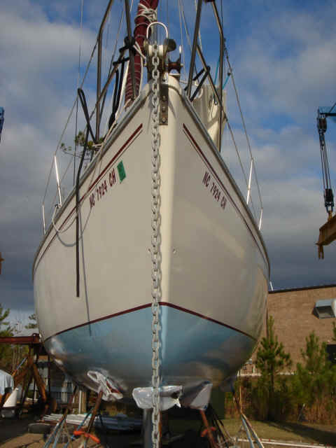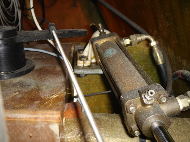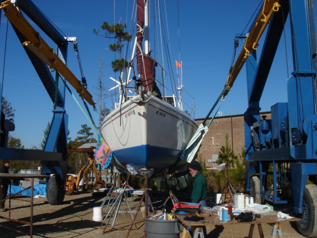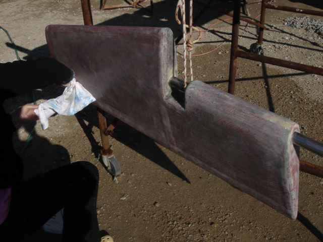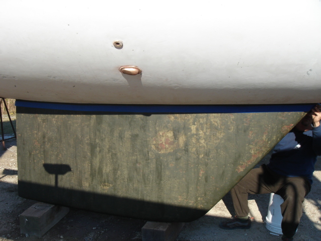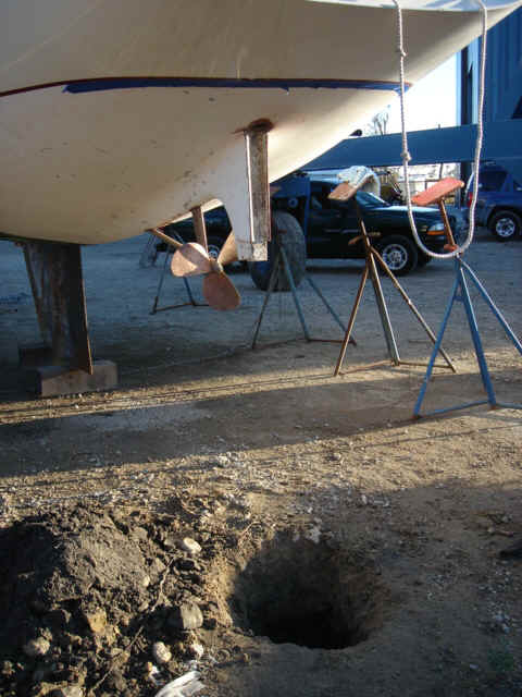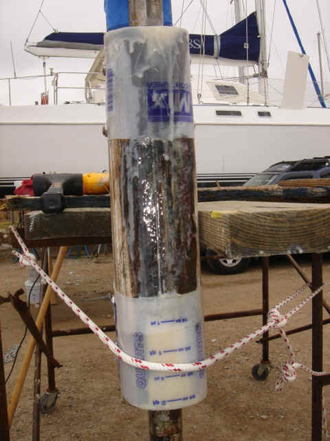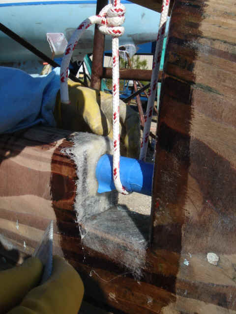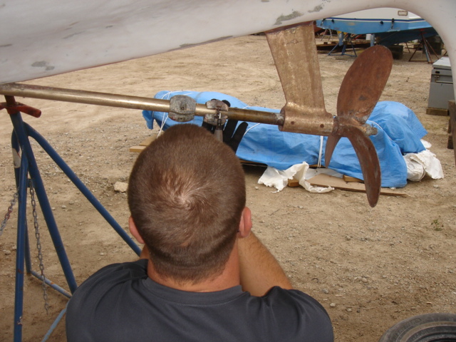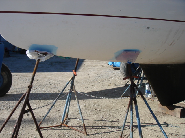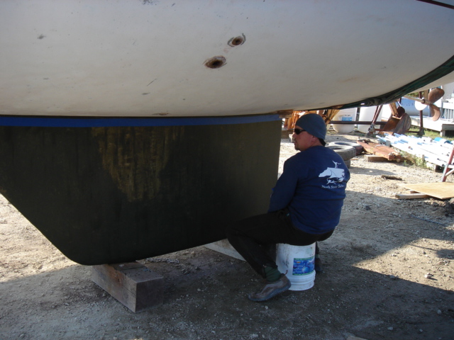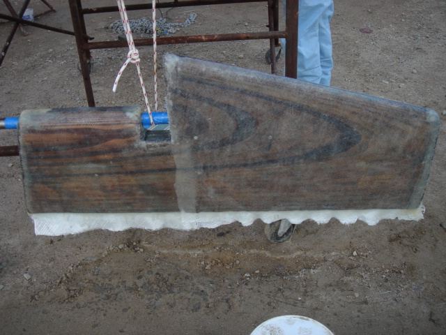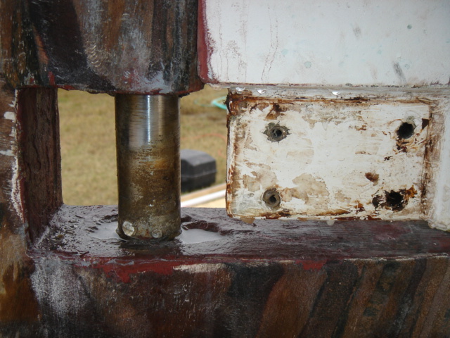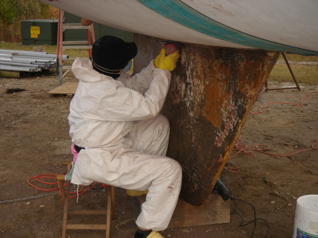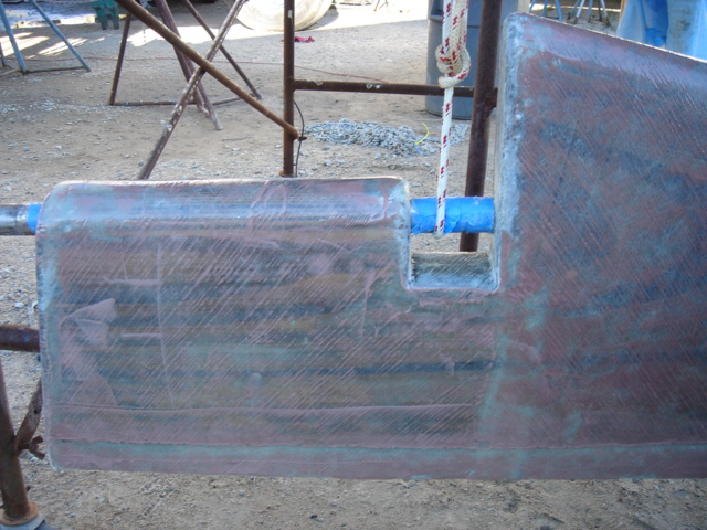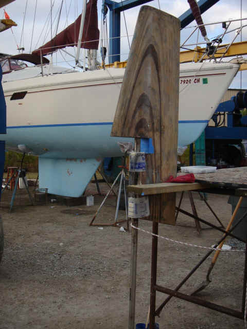 The rudder before the bottom paint was stripped off. When the paint was off, we discovered that the rudder needed some rebuilding and maintenance. So, the decision was made that we had to drop the rudder to complete the work. You can see where the teredo worms had started to work This is the on the inside of the boat where the rudder post connects to the steering quadrant (bottom) and the autopilot control arm (top) This is where the rudder post exits the top of the boat, just behind the cockpit, where there is an emergency tiller post. Lets get this thing disconnected Here are the steering cables exiting the bottom of the steering pedestal You can see how the autopilot control arm is keyed into the rudder post Halfway there Success This is the rudder post stuffing box. It keeps water from entering the boat where the rudder post enters the boat Now, to get the rudder down, the boat had to be lifted, so the forestay had to be loosened And, here comes the travel lift The lift couldn't get the boat quite high enough, so.... Let the digging begin! Four feet later Again, the action's been missed, but the rudder is down. A much better view of the worm damage We dug out all of the soft/bad wood Setting up a vacuum bag to suck epoxy down the rudder post The idea is to pour epoxy down the rudder post and suck it down through the porous wood to where the rudder post is exposed again It worked! You can see the epoxy that was pulled through The rudder went home with us almost every night to be put inside and dried out. The wood has to be completely dry before it is glassed in. Next we, flipped the rudder and epoxied using gravity to pull the epoxy down from the other way Things are starting to come together Now all of the questionable spots have been fixed After a fair bit of sanding to make clearance for the fiberglass, we're ready to glass it in Getting out all of the air bubbles Now a little bit of fairing Preparing the rudder for anti-foul The first coat of bottom paint The final coat of bottom paint Now for a personal touch Next, we get ready to remount the rudder. All of the steering components must be cleaned, polished a greased before they are refitted.
