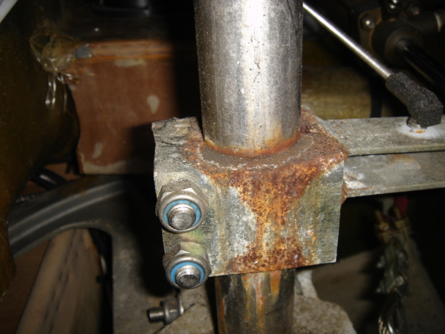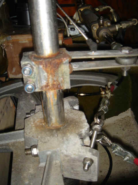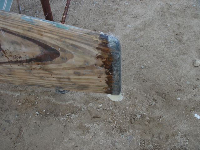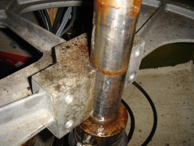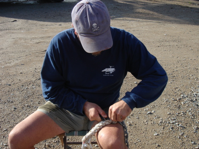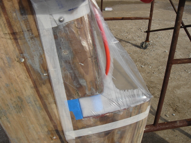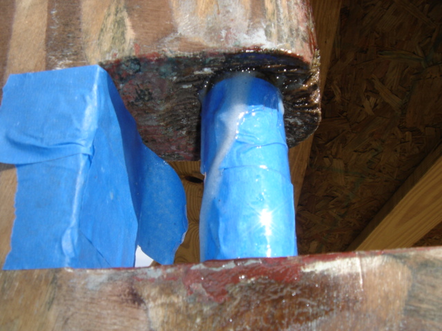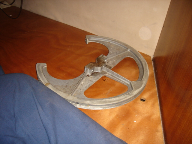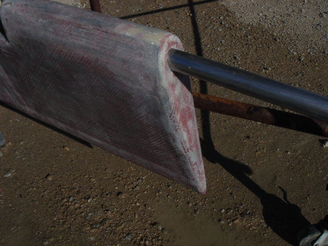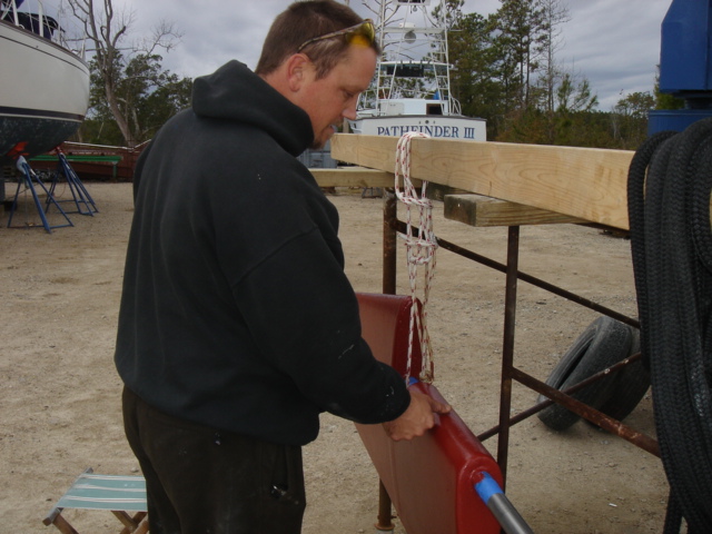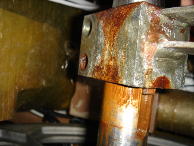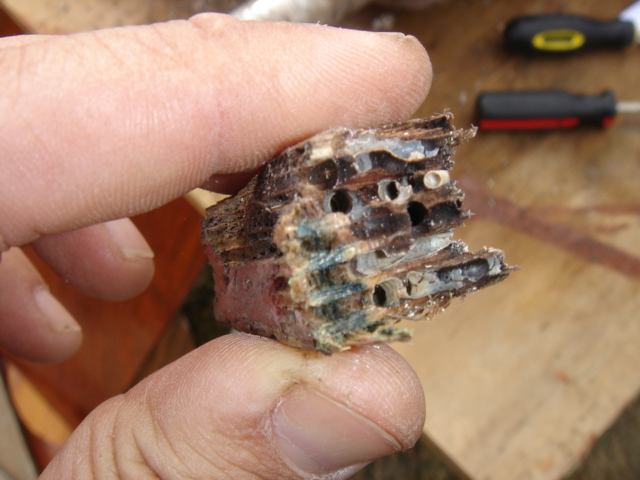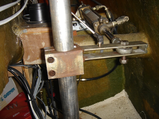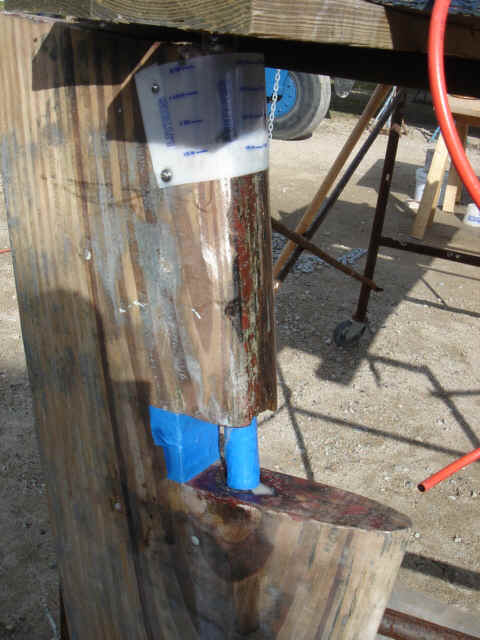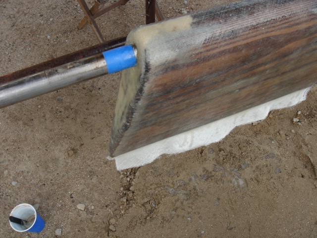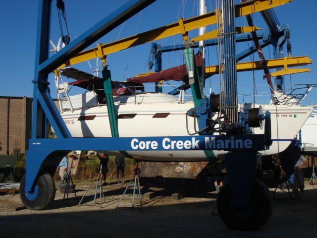 The rudder before the bottom paint was stripped off. When the paint was off, we discovered that the rudder needed some rebuilding and maintenance. So, the decision was made that we had to drop the rudder to complete the work. You can see where the teredo worms had started to work This is the on the inside of the boat where the rudder post connects to the steering quadrant (bottom) and the autopilot control arm (top) This is where the rudder post exits the top of the boat, just behind the cockpit, where there is an emergency tiller post. Lets get this thing disconnected Here are the steering cables exiting the bottom of the steering pedestal You can see how the autopilot control arm is keyed into the rudder post Halfway there Success This is the rudder post stuffing box. It keeps water from entering the boat where the rudder post enters the boat Now, to get the rudder down, the boat had to be lifted, so the forestay had to be loosened And, here comes the travel lift The lift couldn't get the boat quite high enough, so.... Let the digging begin! Four feet later Again, the action's been missed, but the rudder is down. A much better view of the worm damage We dug out all of the soft/bad wood Setting up a vacuum bag to suck epoxy down the rudder post The idea is to pour epoxy down the rudder post and suck it down through the porous wood to where the rudder post is exposed again It worked! You can see the epoxy that was pulled through The rudder went home with us almost every night to be put inside and dried out. The wood has to be completely dry before it is glassed in. Next we, flipped the rudder and epoxied using gravity to pull the epoxy down from the other way Things are starting to come together Now all of the questionable spots have been fixed After a fair bit of sanding to make clearance for the fiberglass, we're ready to glass it in Getting out all of the air bubbles Now a little bit of fairing Preparing the rudder for anti-foul The first coat of bottom paint The final coat of bottom paint Now for a personal touch Next, we get ready to remount the rudder. All of the steering components must be cleaned, polished a greased before they are refitted.