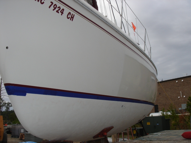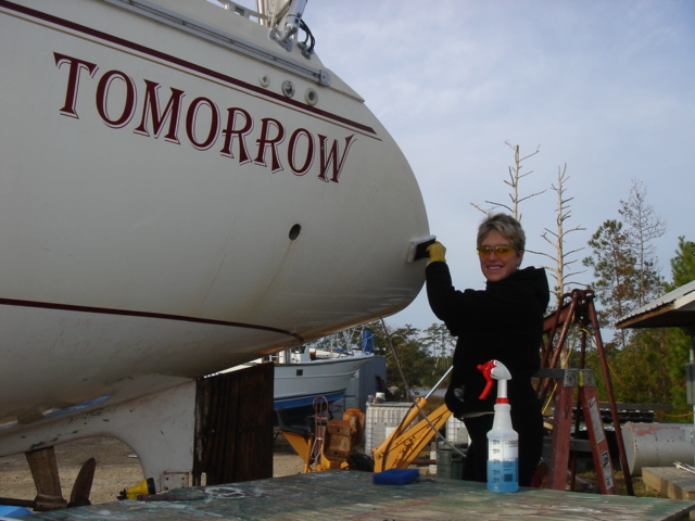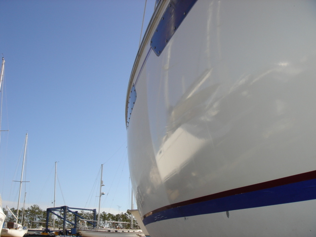 After being in the yard for four months, the topsides needed some cleaning and waxing One of "those moments" where the light at the end of the tunnel seems very dim After cleaning the hull, we applied PolyGlow. It worked pretty well. This is a gash in the gel coat that was a result of a nail in a piling